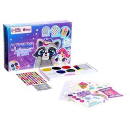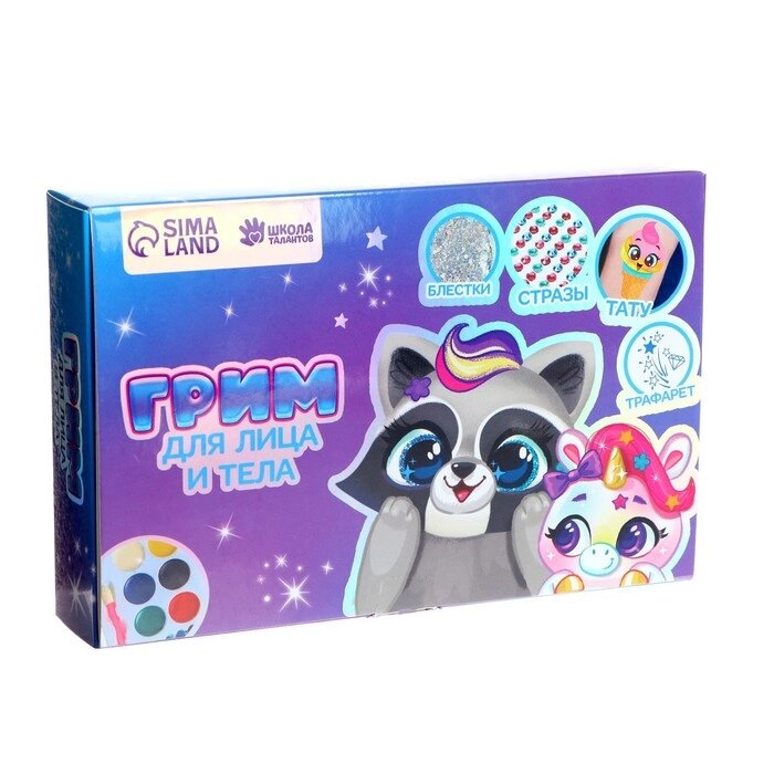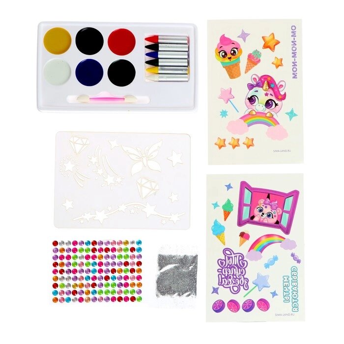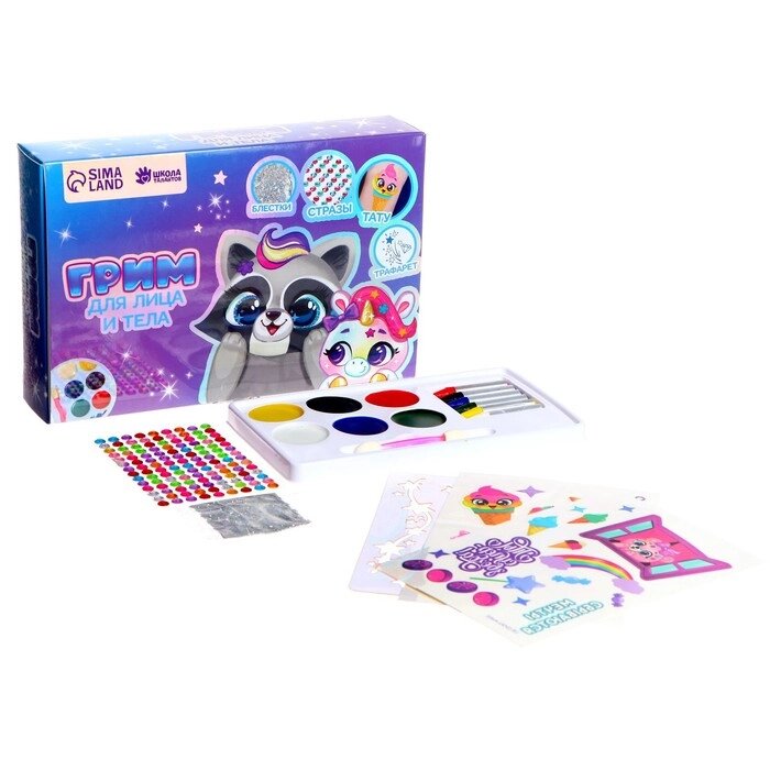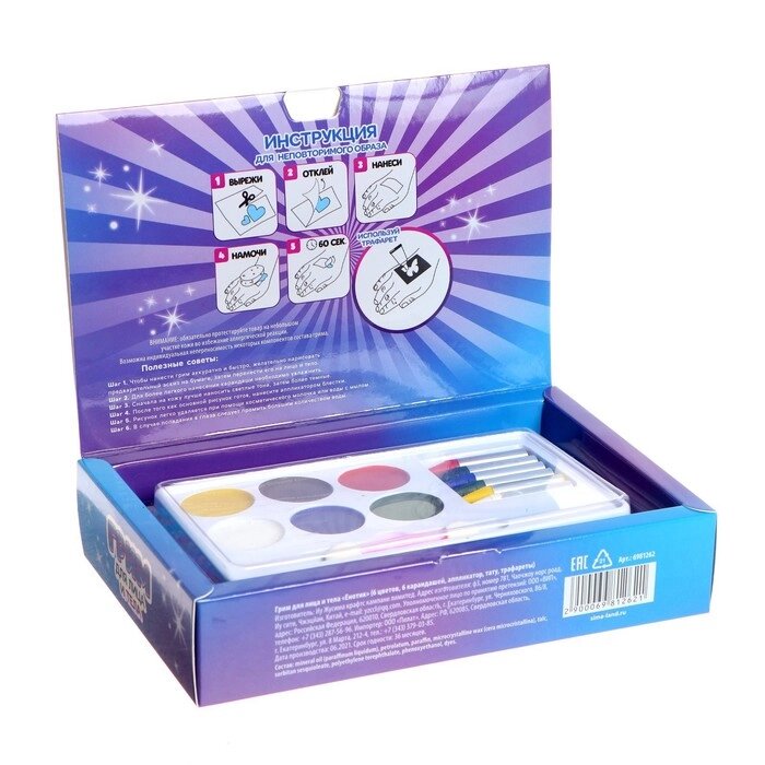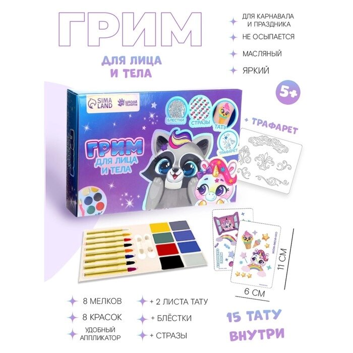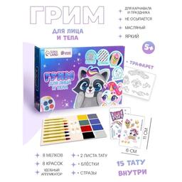 Грим для лица и тела, 6 цветов, 6 карандашей, аппликатор, тату, трафареты "Енотик"