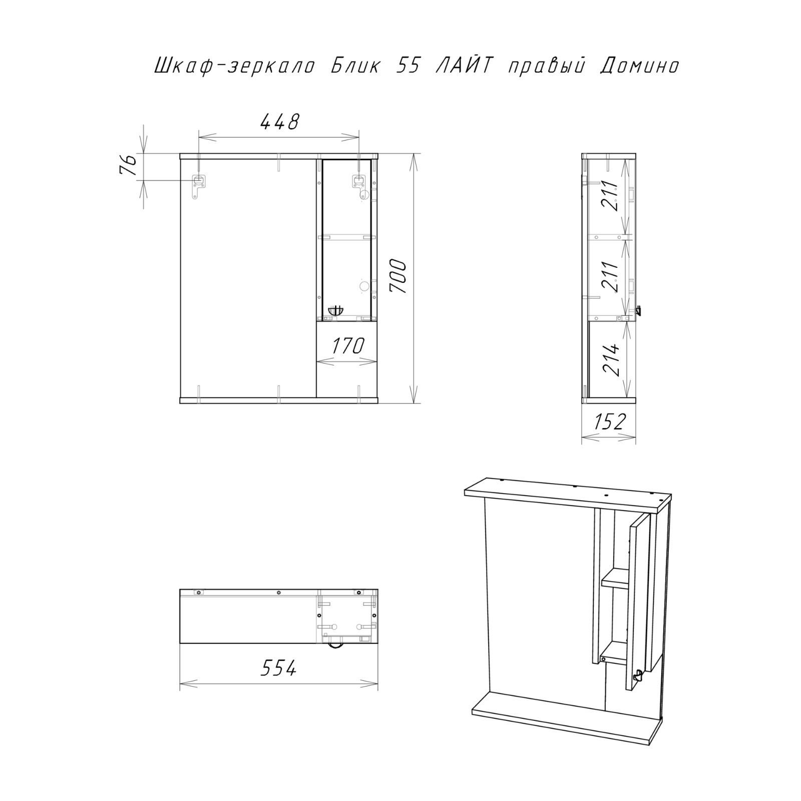 Шкаф-зеркало Блик 55 ЛАЙТ правый Домино 15,4 см х 56,5 см х 77 см