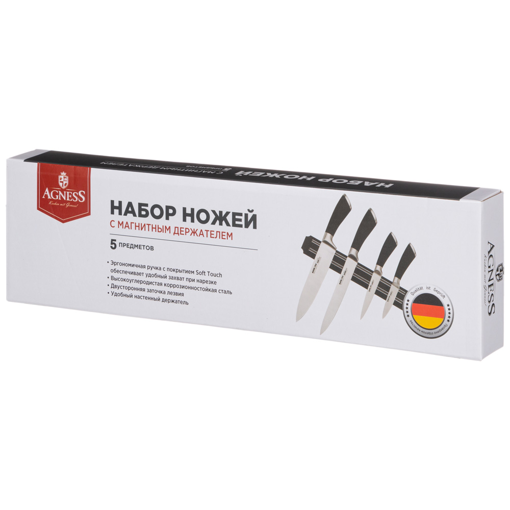 НАБОР НОЖЕЙ AGNESS 5 ПР.С МАГНИТНЫМ ДЕРЖАТЕЛЕМ И РУЧКОЙ ИЗ НЕРЖ.СТАЛИ 911-045