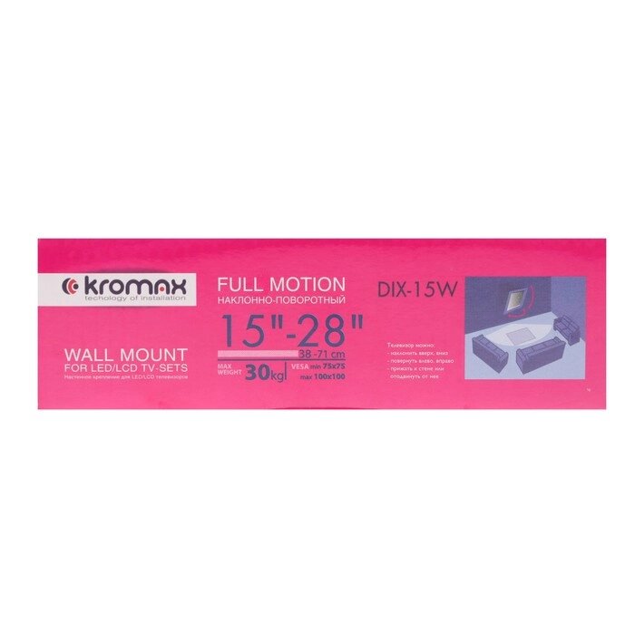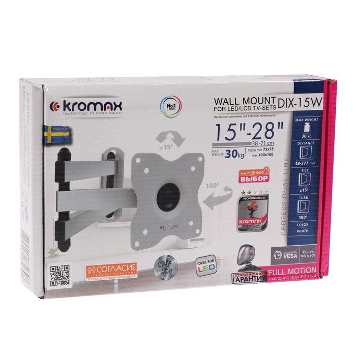 Кронштейн Kromax DIX-15W, для ТВ, наклонно-поворотный, 15-28", 48-377 мм от стены, белый