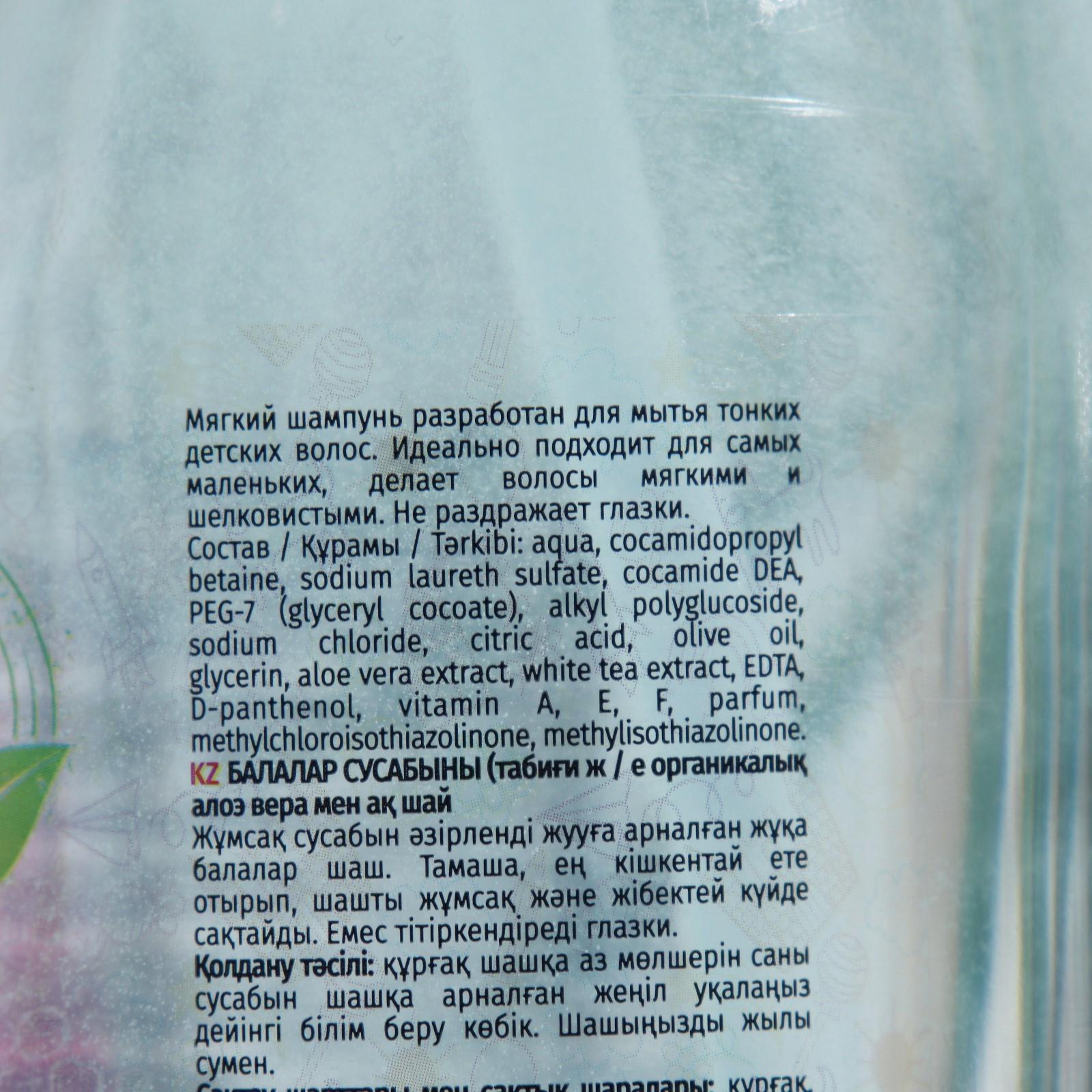 Состав: aqua, cocamidopropyl betaine, sodium laureth sulfate, cocamide DEA, PEG-7 (glyceryl cocoate), alkyl polyglucoside, sodium chloride, styrene/acrylates copolymer, citric acid, olive oil, glycerin, chamomilla extract, calendula extract, bidens tripartita extract, EDTA, D-panthenol, vitamin A, E, F, parfum, methylchloroisothiazolinone, methylisothiazolinone.