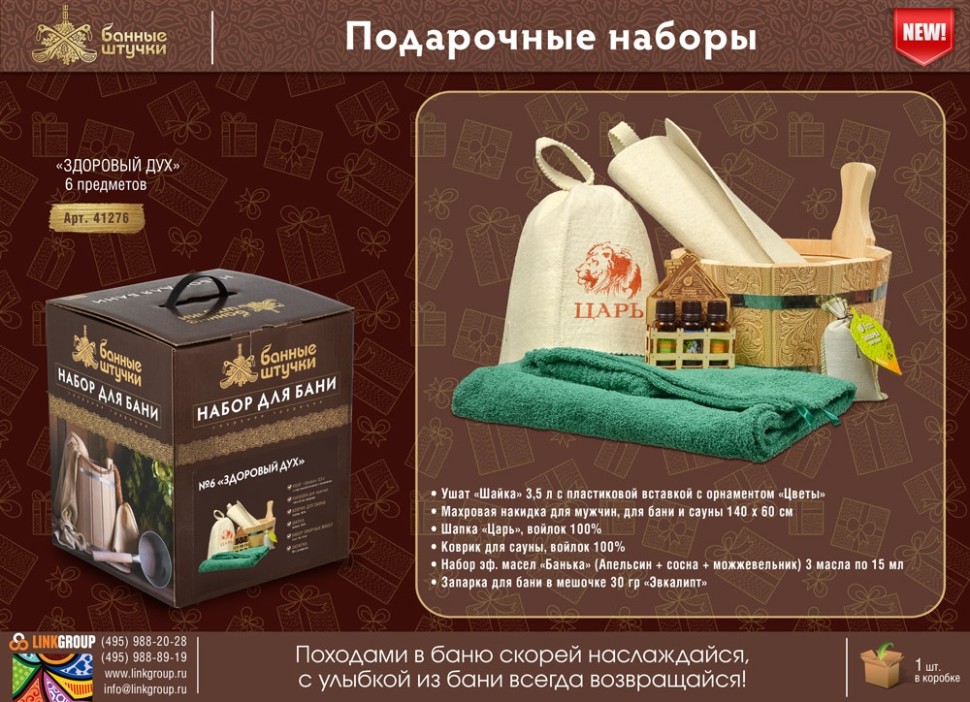 В подарочных банных наборах есть всё необходимое для создания незабываемой атмосферы и отличного настроения в парной! Сделайте приятный сувенир Вашим близким - подарите им один из этих замечательных наборов, и может быть, любителей бани станет еще больше.