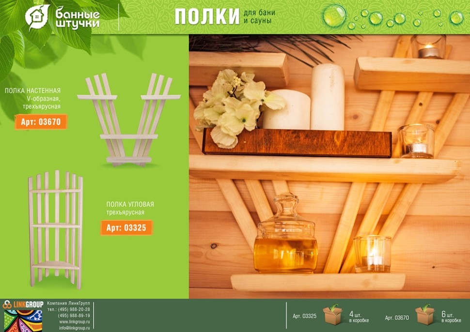 Дерево липа известно своими уникальными лечебными свойствами. Изделия, выполненные из липы, стойки к влаге и появлению грибка, что делает липу самым популярным материалом для изготовления аксессуаров для бани и сауны. Широкий ассортимент практичных и функциональных вешалок и полок из липы и металла дает возможность выбрать необходимый аксессуар для любого интерьера.