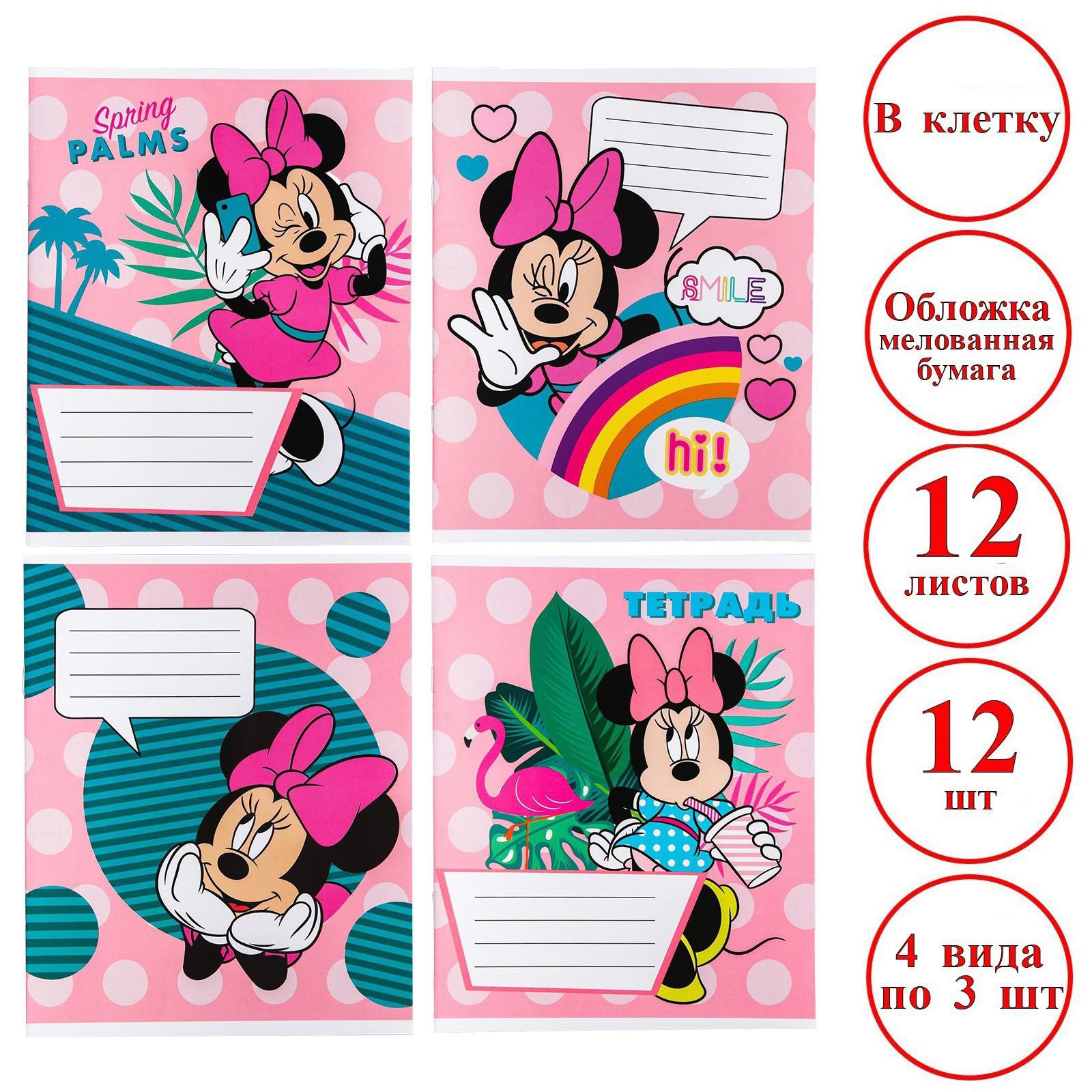 Комплект тетрадей из 12 шт "Минни Маус", 12 листов, в клетку, обложка бумага мелованная