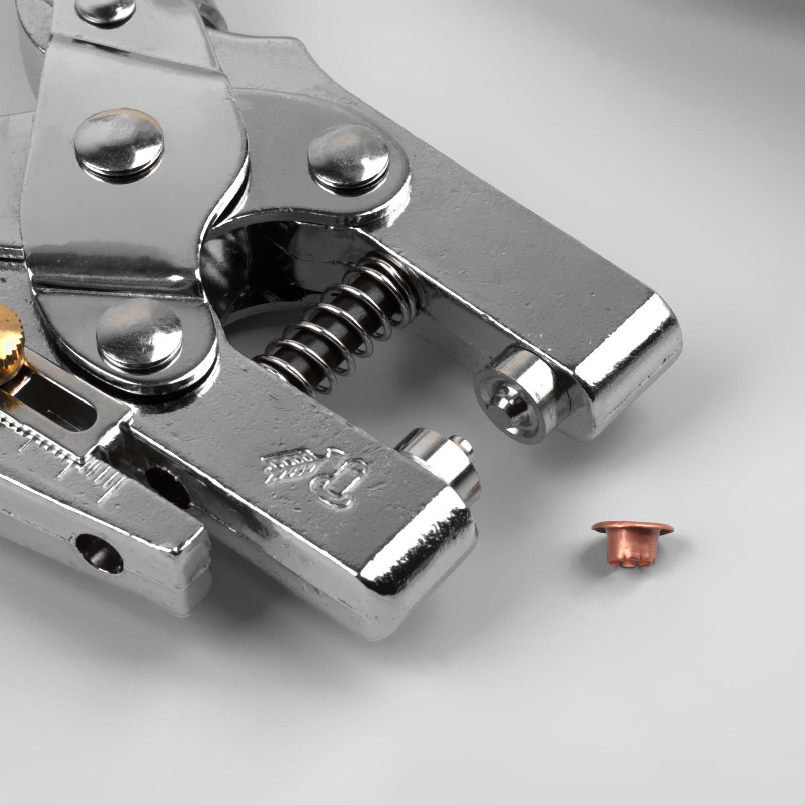 С помощью таких щипцов вы с лёгкостью установите блочки, люверсы, обычные или джинсовые кнопки. Изделие выполнено из прочного металла и удобно в работе.