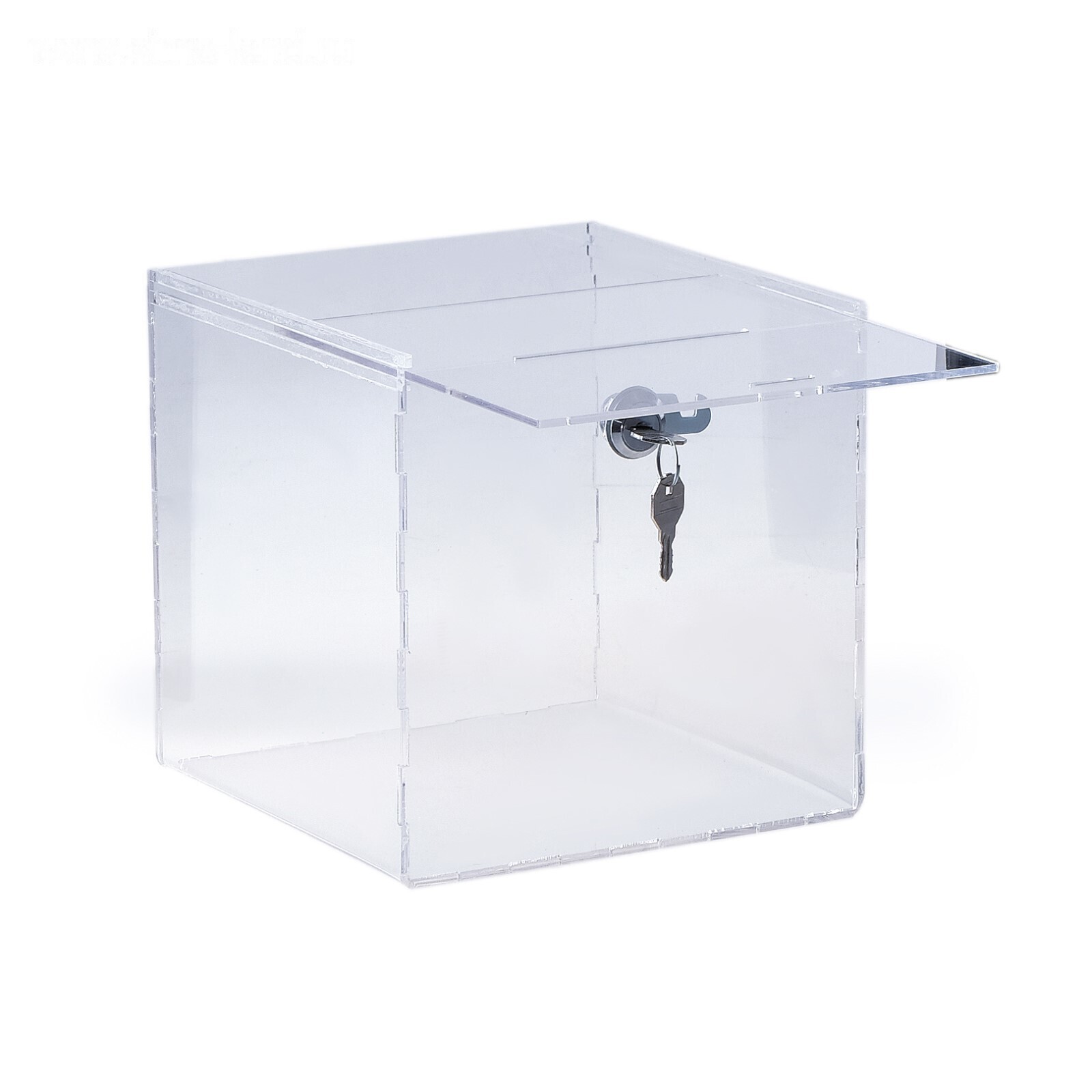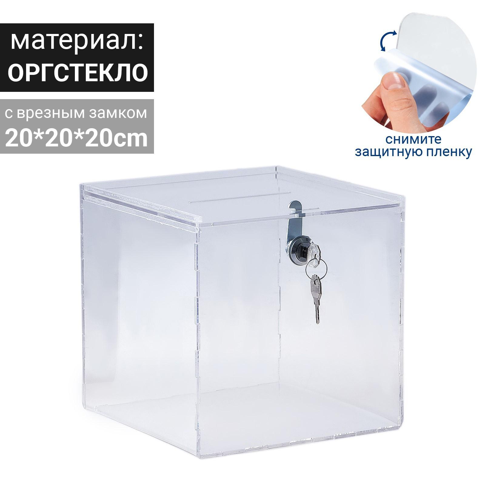 Ящик для сбора денег с врезным замком, отверстие 100*4мм, оргстекло 2 мм, 20*20*20 см. В ЗАЩИТНОЙ ПЛЁНКЕ