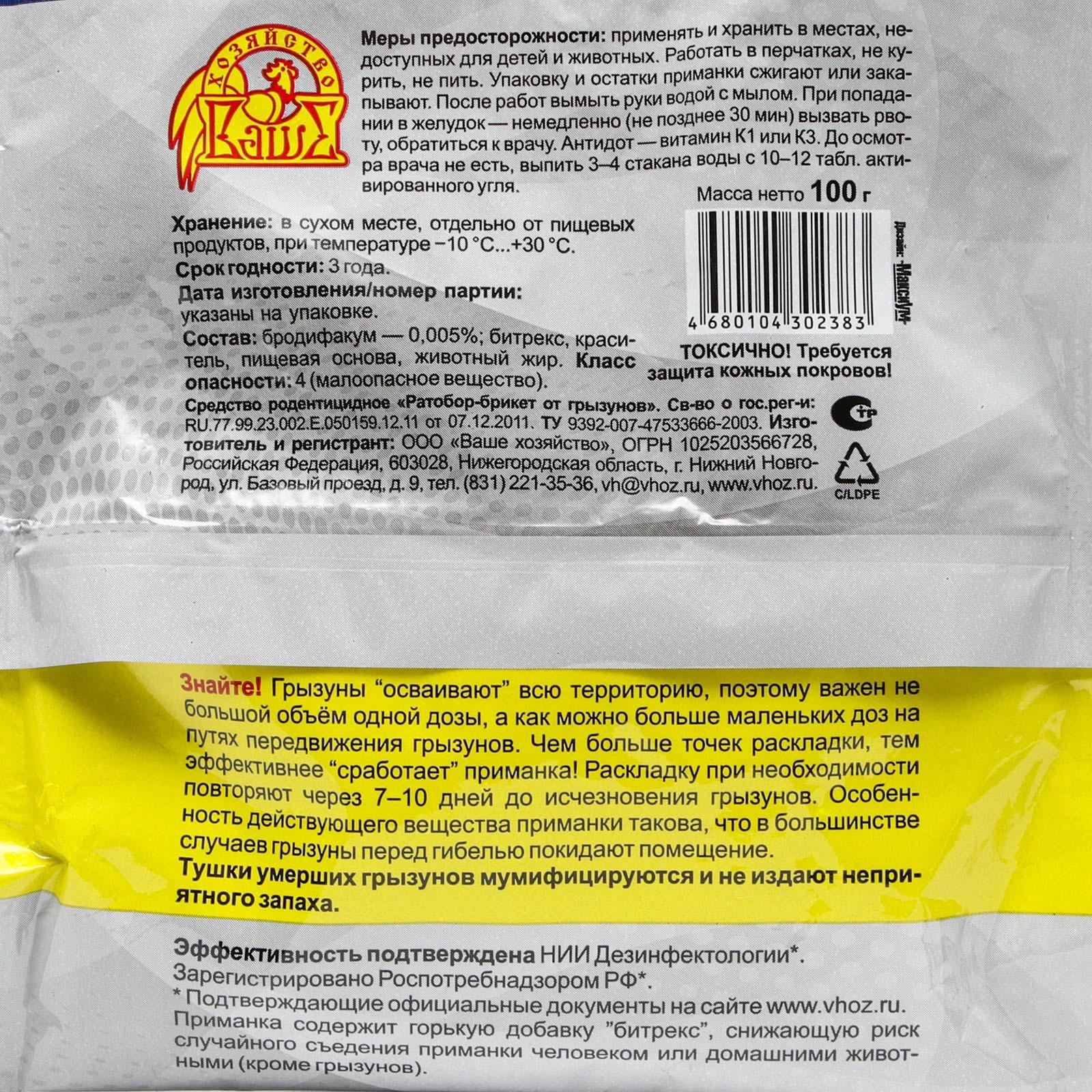 Применение: брикеты раскладывают на подложки (б/у жестяные крышки, картонки) или в лотки по 1 шт. против мышей и по 1–2 шт. против крыс вблизи от нор, вдоль стен и перегородок через 2–4 метра.