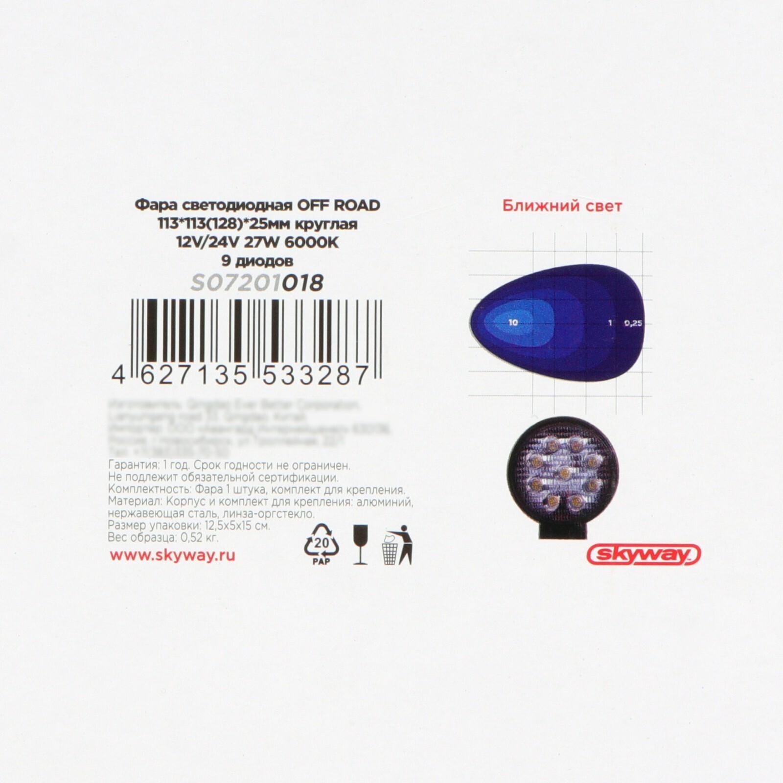 Фара светодиодная Skyway OFF ROAD 115 мм, круглая, 12/ 24 В, 27 Вт, 6000K, 9 диодов