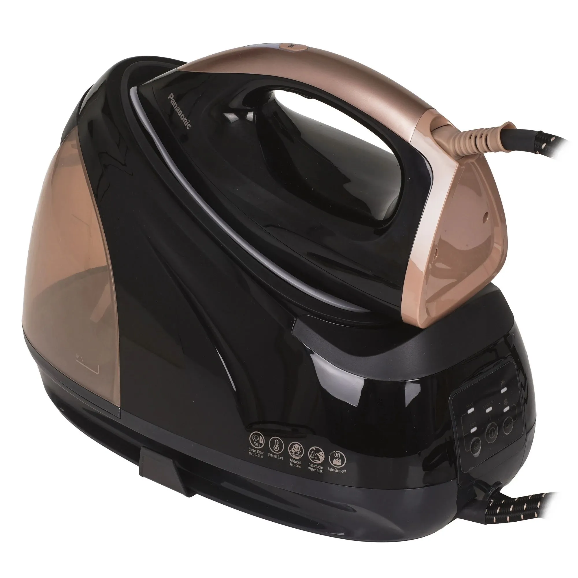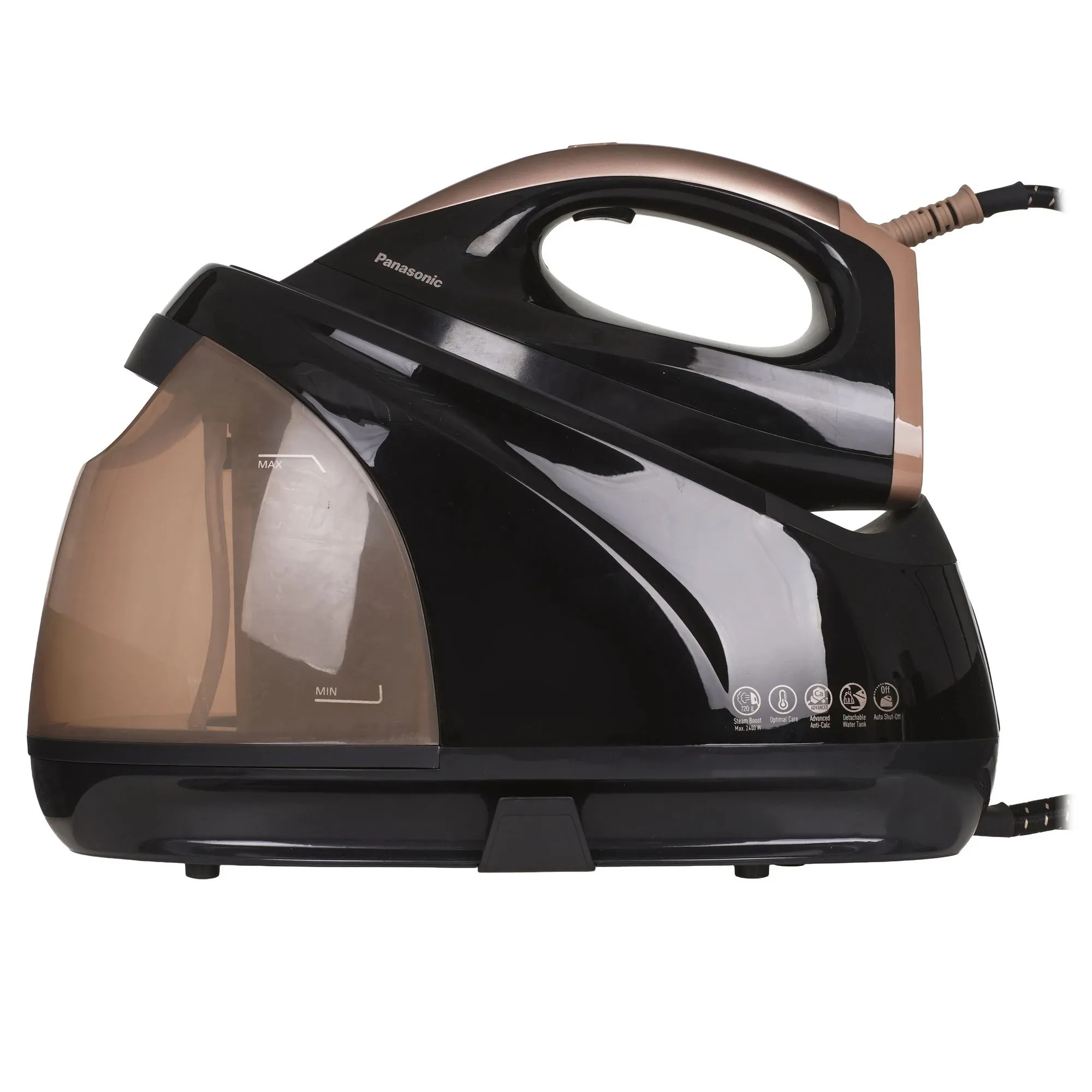 Парогенератор Panasonic NI-GT500NTW оснащен функциями парового удара, вертикального отпаривания и сухого глажения. Модель готова к работе через 3 минуты после включения. Система очистки от накипи позволяет использовать водопроводную воду. Шаровое крепление не дает кабелю перекручиваться.