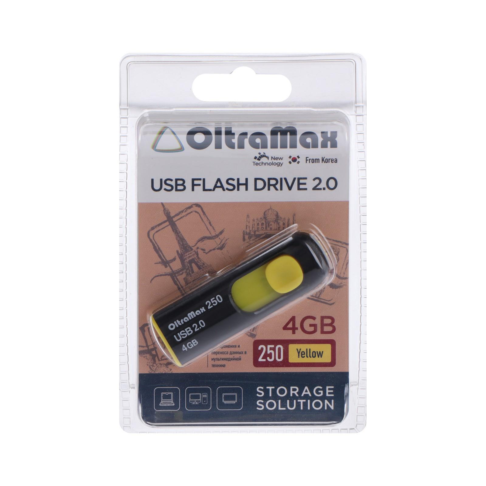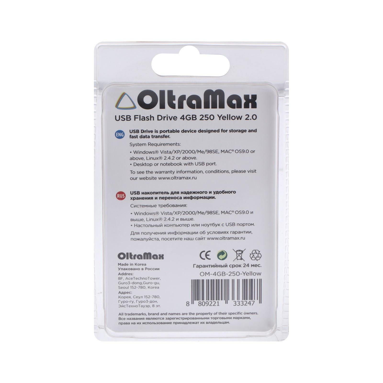 Флешка OltraMax 250, 4 Гб, USB2.0, чт до 15 Мб/с, зап до 8 Мб/с, жёлтая