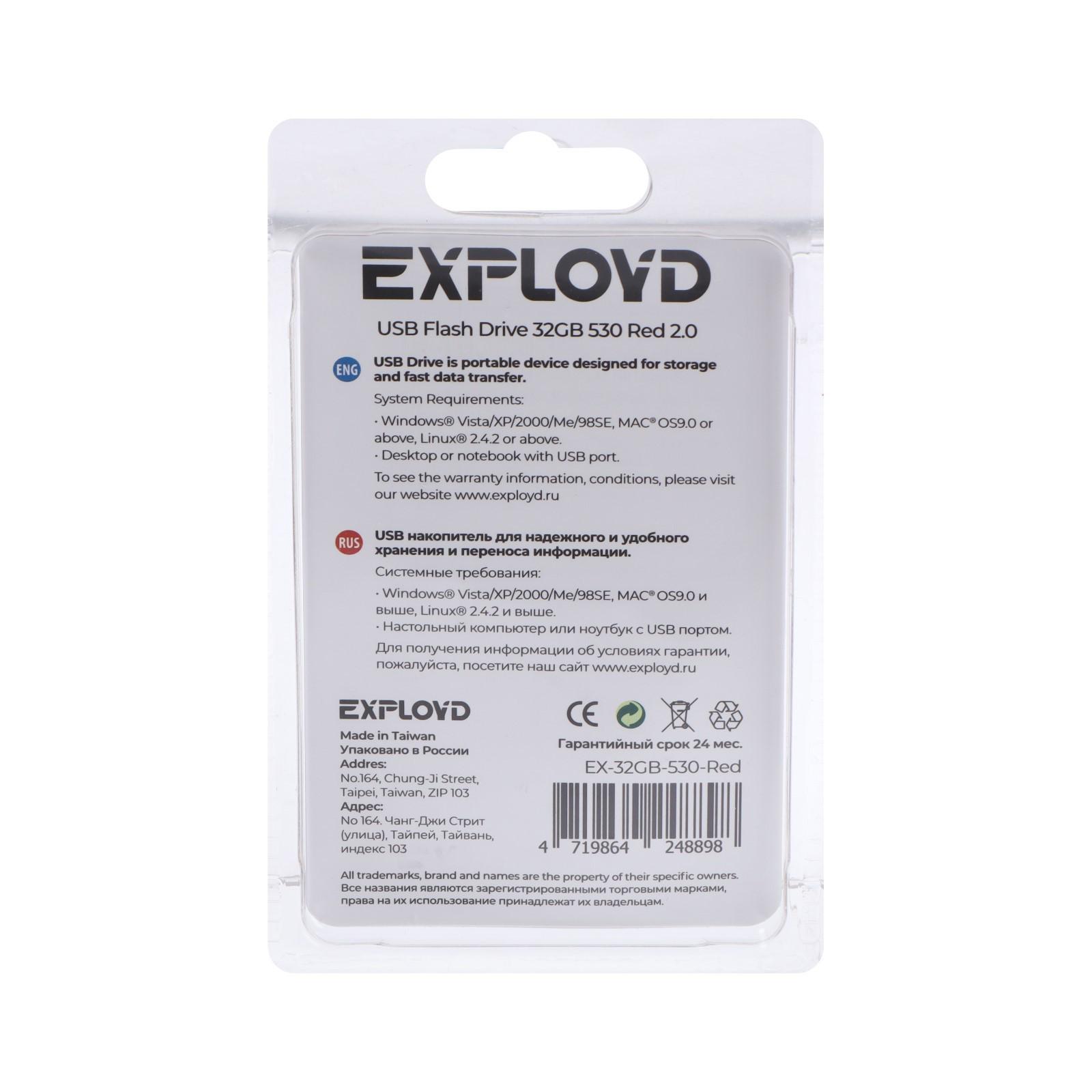 Флешка Exployd 530, 32 Гб, USB2.0, чт до 15 Мб/с, зап до 8 Мб/с, красная