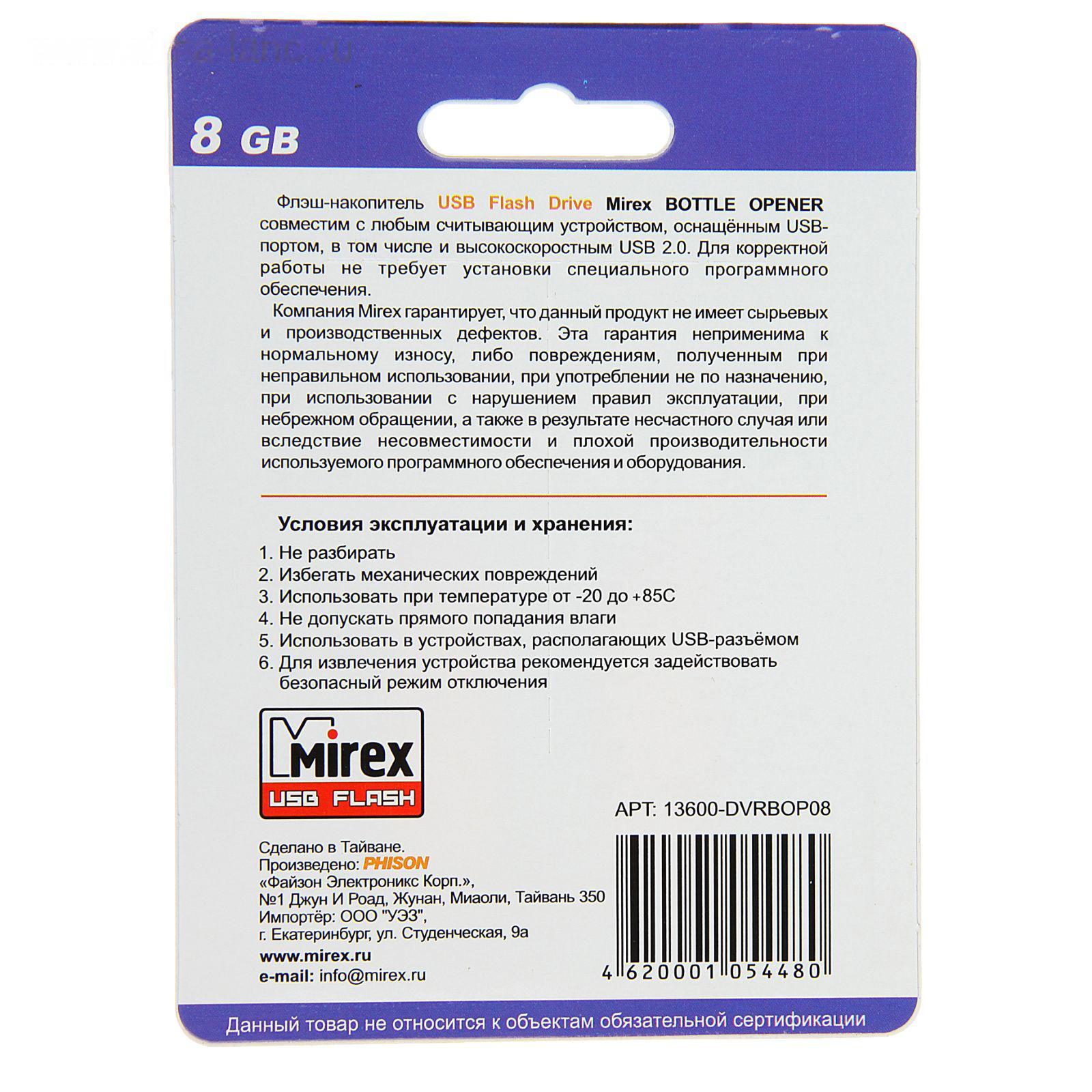 Флешка Mirex BOTTLE OPENER, 8 Гб, USB2.0, "открывашка", чт до 25 Мб/с, зап до 15 Мб/с
