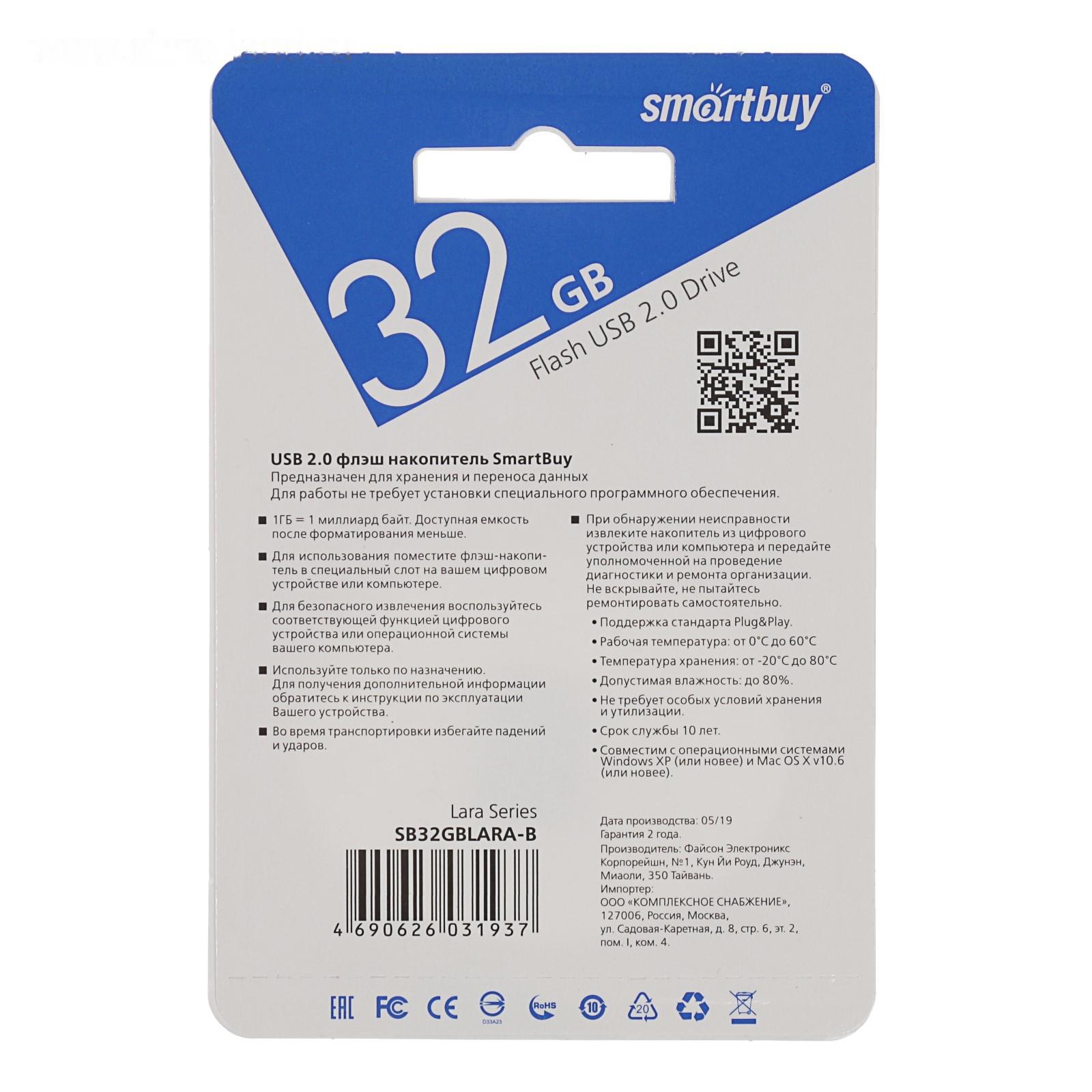 Флешка Smartbuy Lara, 32 Гб, USB2.0, чт до 25 Мб/с, зап до 15 Мб/с, синяя