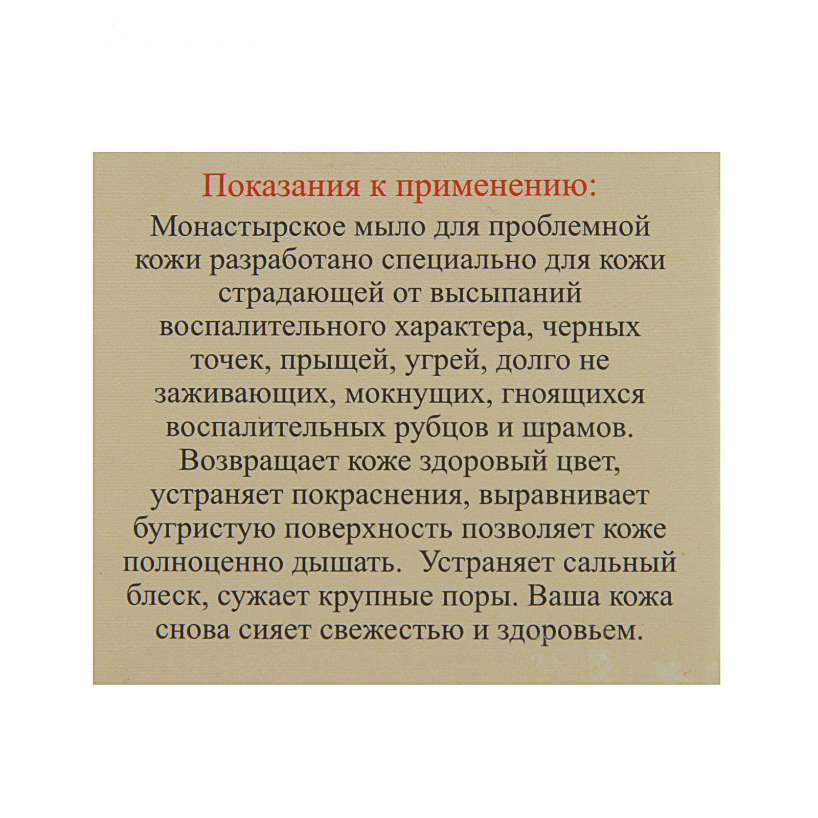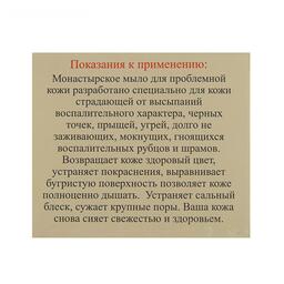 При ежедневном использовании монастырское мыло для проблемной кожи устраняет раздражение, шелушение, покраснение, снимает ощущение покалывания, жжения и стянутости. Мыло изготовлено под молитвенным омофором братьев мужского монастыря «Крестовая пустынь» посёлка Солох-аул.