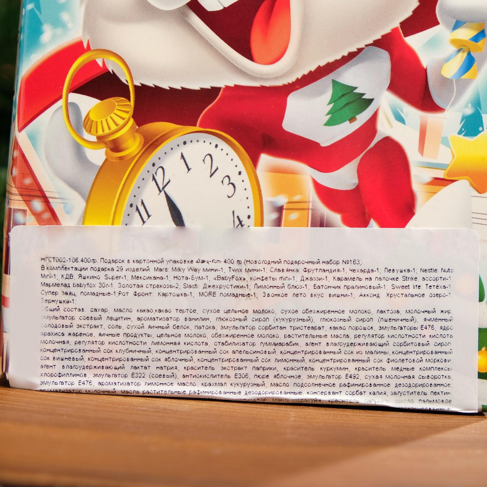 В комплектации подарка 28 изделий: Mars: Nestle: Slasti: Sweet life: Красный Октябрь: Рот Фронт: Славянка: Акконд: