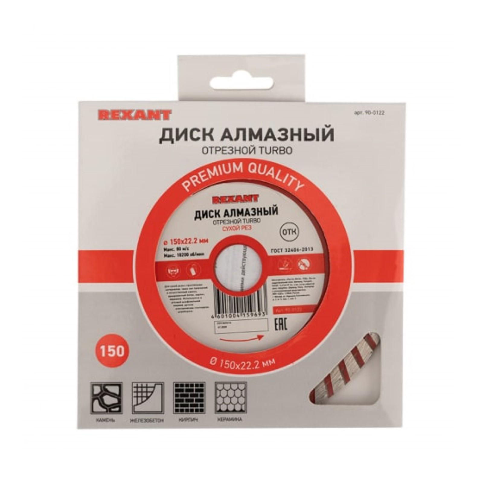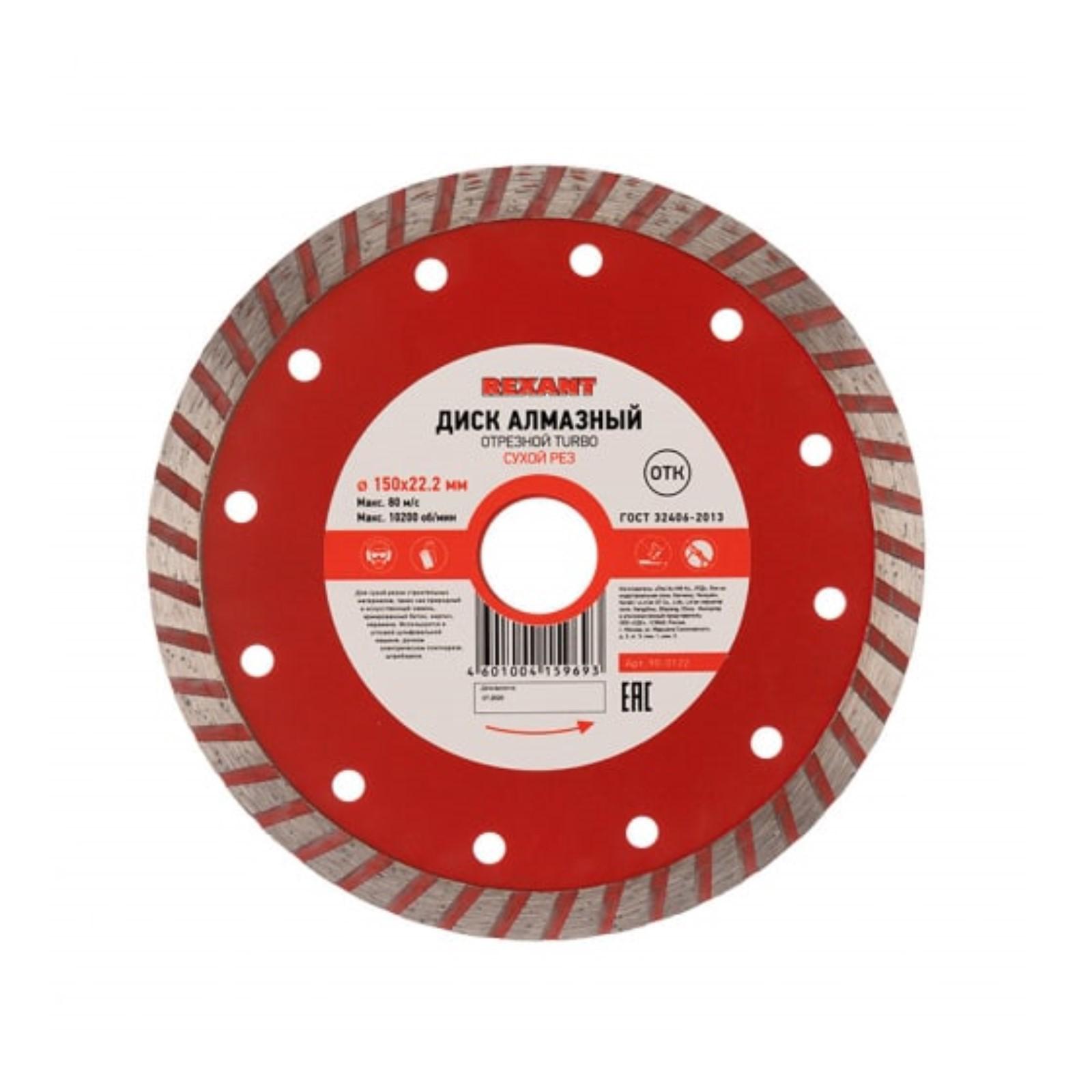 Диск алмазный отрезной REXANT Turbo, сплошной, сухой рез, 150x22.2 мм