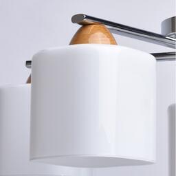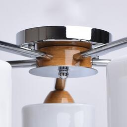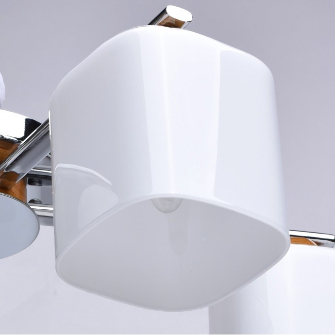 Арматура светильника выполнена из сплава железа и гальванизирована в цвет хрома. Светильник декорирован вставками из каучукового дерева гевеи и стеклянными плафонами квадратного сечения, окрашенными изнутри.
