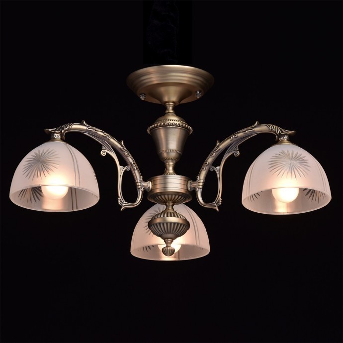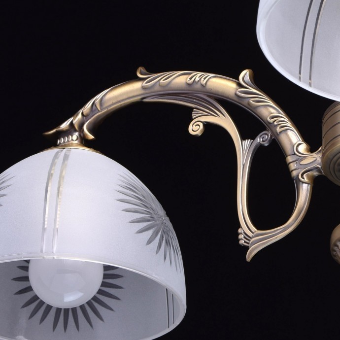 Основание: комбинация сплавов металлов, гальванизировано в цвет бронзы с патинированием и лакированием. Потолочная чаша, центральный стержень, корпус, заверсша, декоративные розетки: металл, прессование. Рожки, декоративная гайка: сплав алюминия, художественное литье. Плафон: отлит в форму, матирование в белый цвет, рисунок нанесен алмазным резцом.