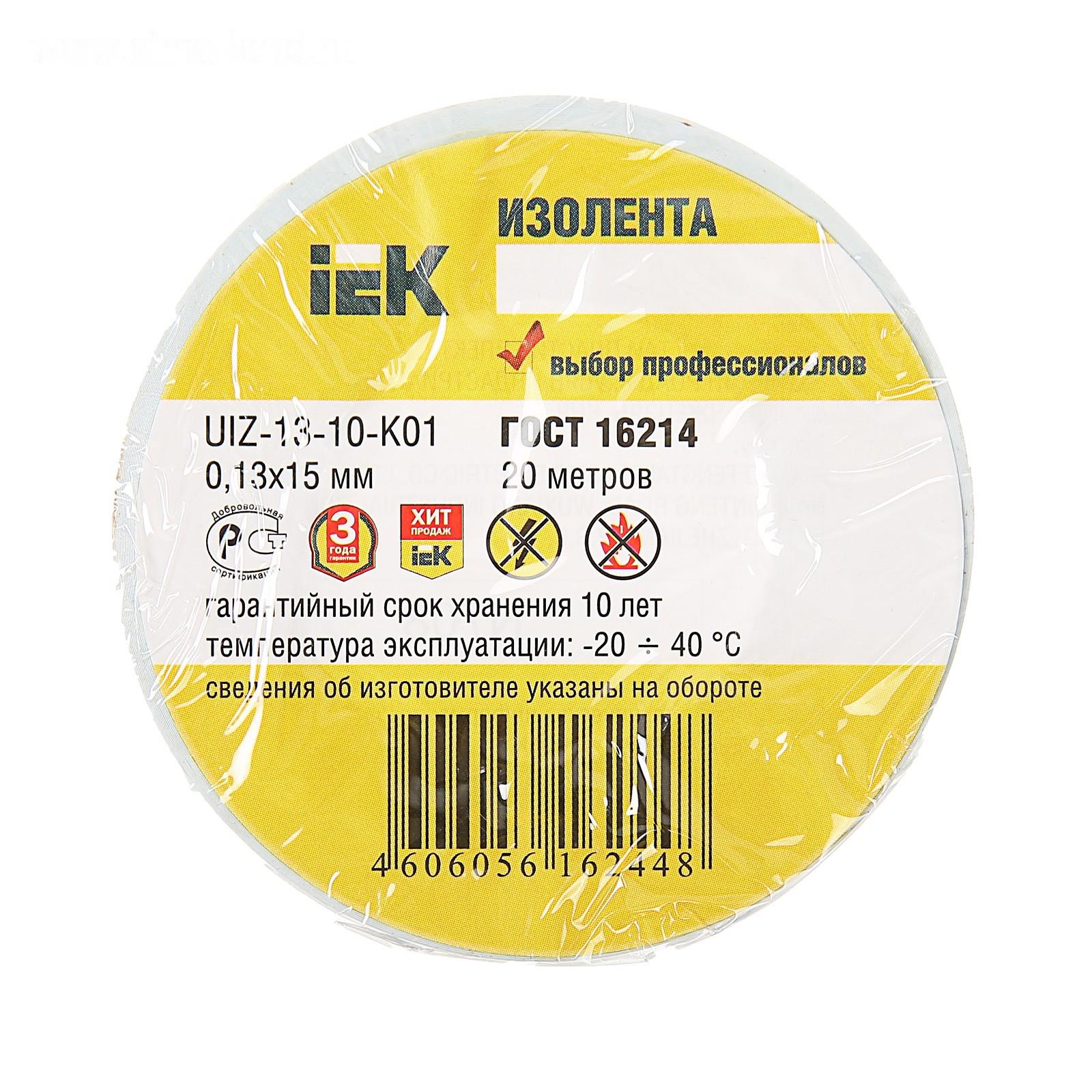 Изолента IEK, ПВХ, 15 мм х 20 м, 130 мкм, белая, UIZ-13-10-K01