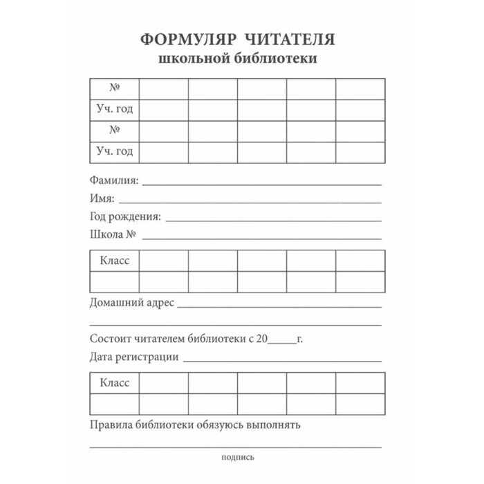 Бланк. Формуляр читателя школьной библиотеки КЖ-116
