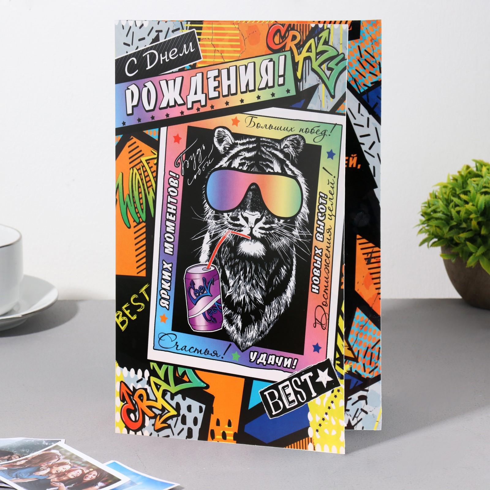Открытка "С Днём Рождения!" тигр, очки, 12,5х19 см