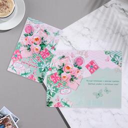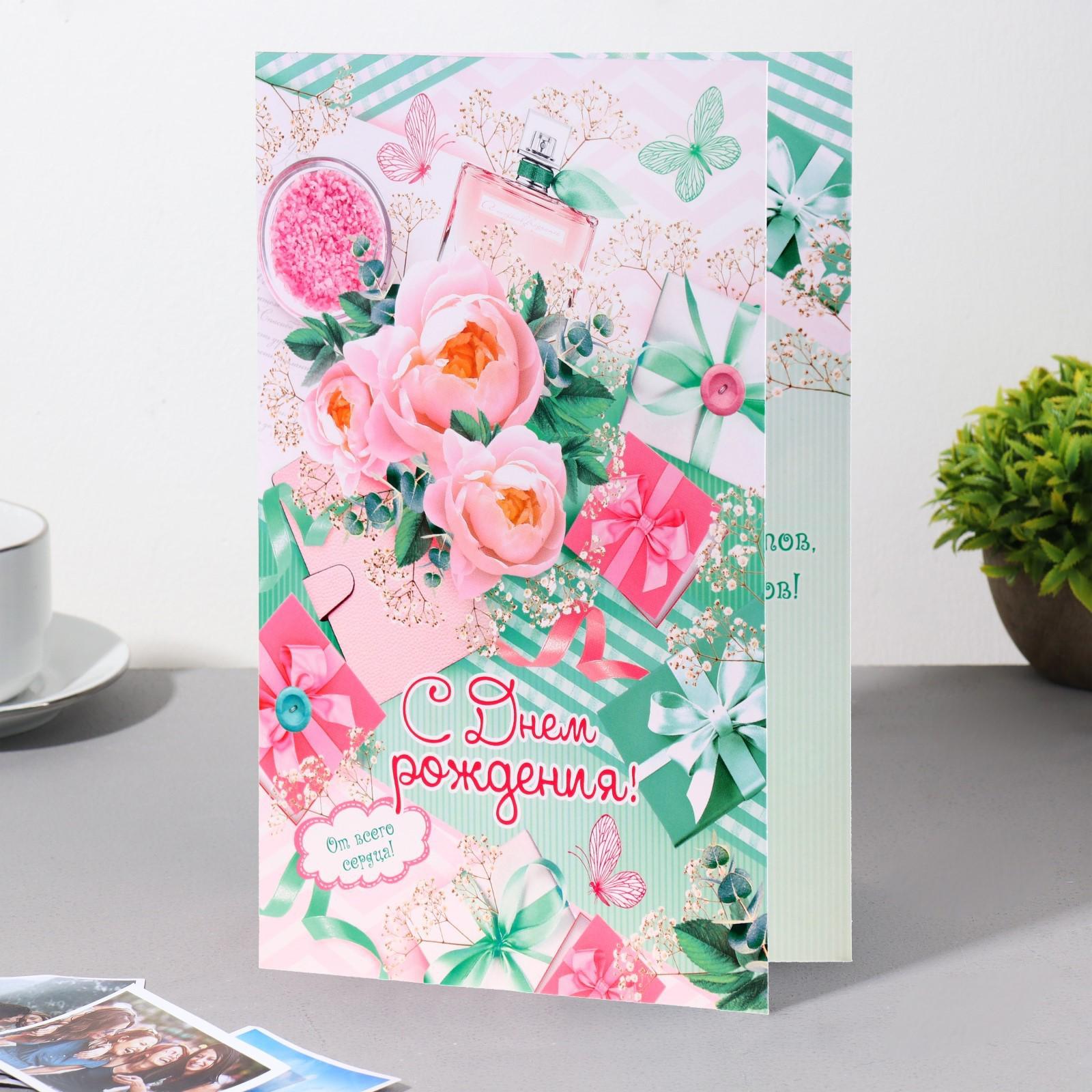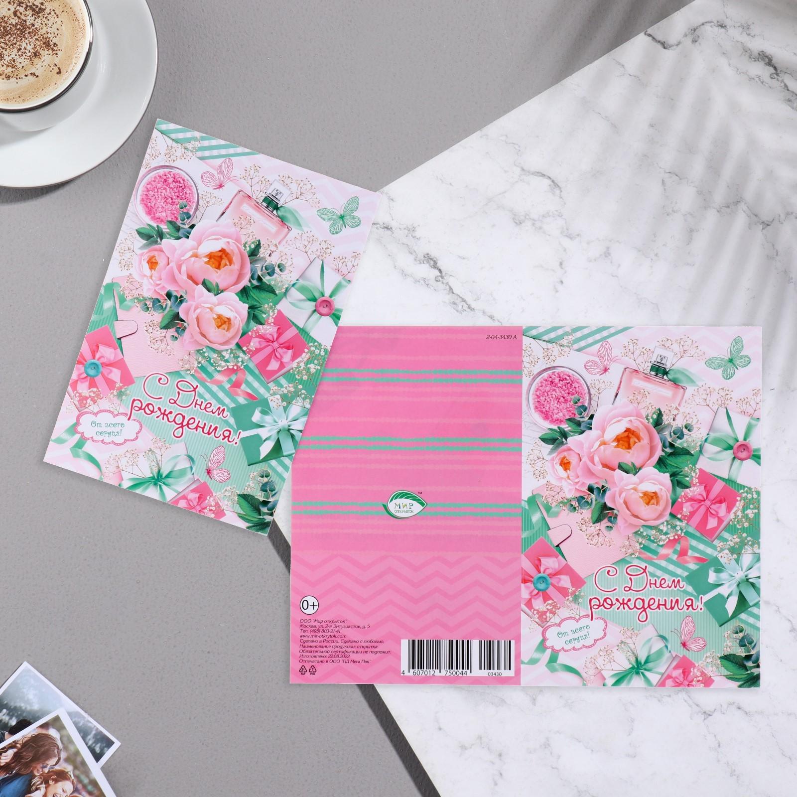 Открытка "С Днём Рождения!" пионы, подарки, духи, 12,5х19 см