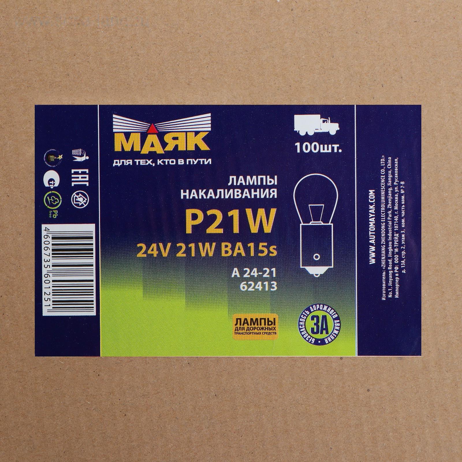 Лампа автомобильная "Маяк", P21W (BA15S), 24 В