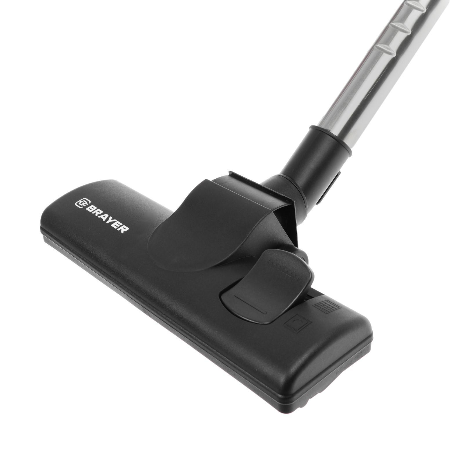 Пылесос BRAYER 4223BR имеет максимальную мощность 1800 Вт. Мощность всасывания составляет 380 Вт. Переключатель регулировки мощности находится на корпусе. Ёмкость мешка для пыли составляет 2,5 л. Длина стальной телескопической трубы: 90 см.