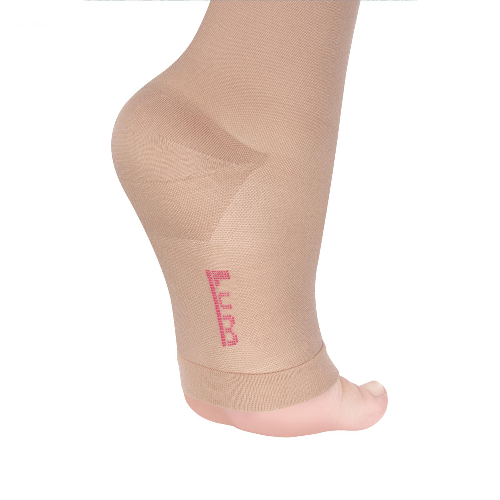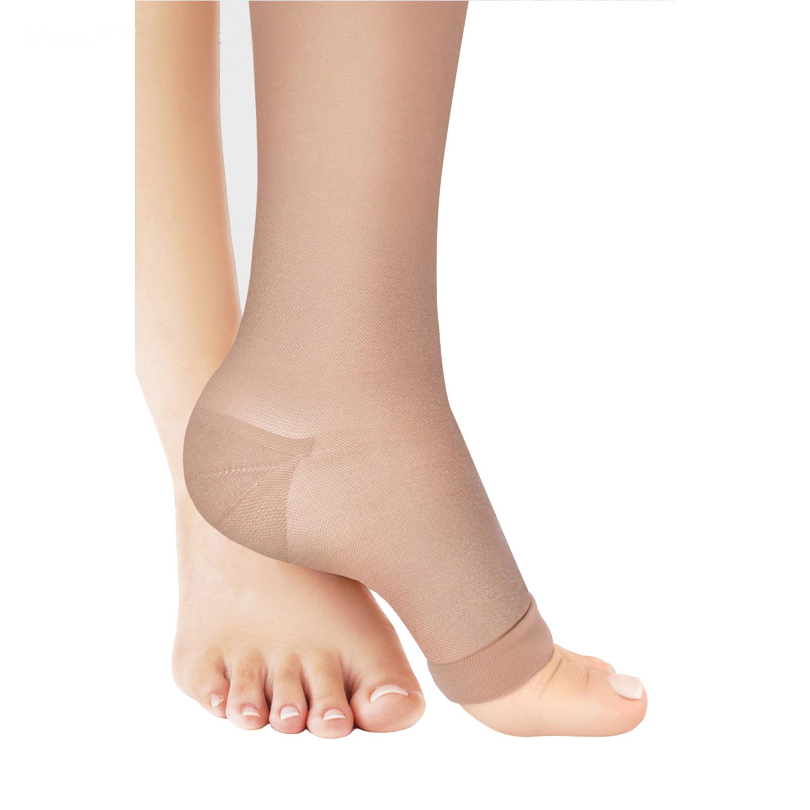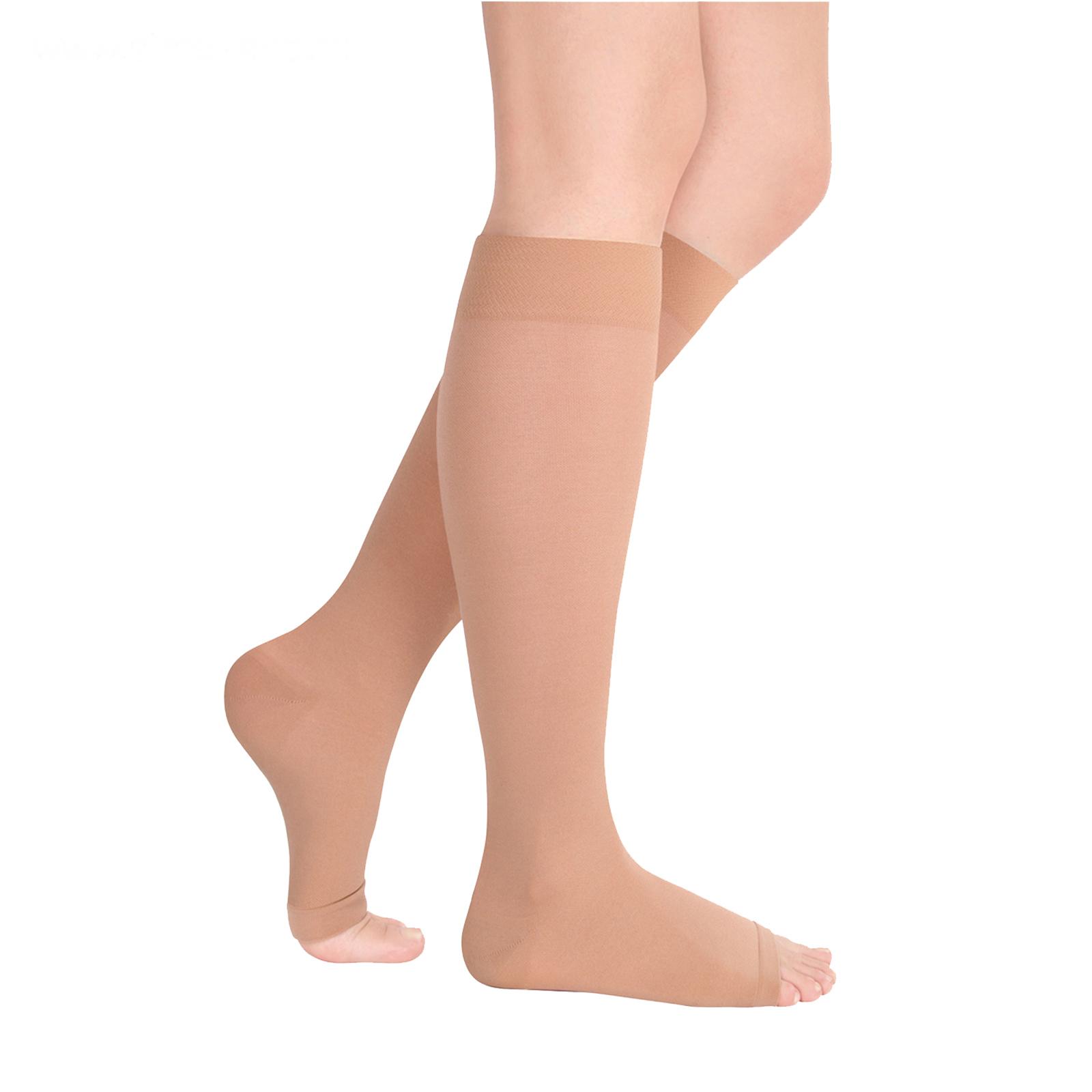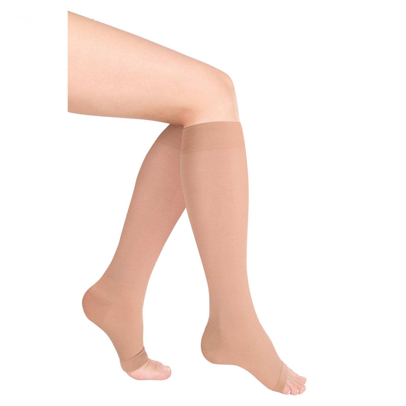 Компрессионные гольфы с открытым носком изготовлены из воздухо- и влагопроницаемого материала. Принимают анатомическую форму, плотно прилегают к ноге. Сверхпрочные эластичные нити в области стопы обеспечивают повышенную износоустойчивость, а плоские швы не оставляют следов на теле.
