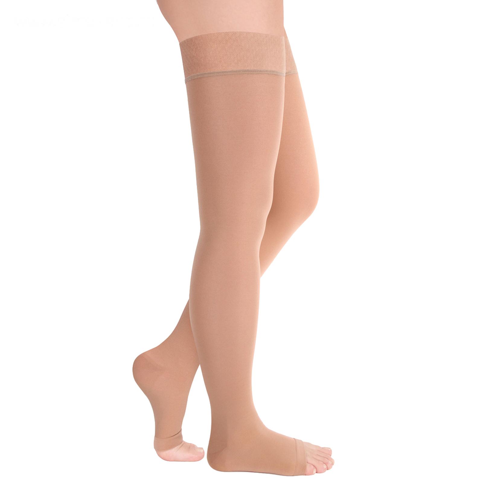 Чулки с резинкой на силиконовой основе и закрытым носком изготовлены из воздухо- и влагопроницаемого материала. Принимают анатомическую форму, комфортно прилегают к ноге.