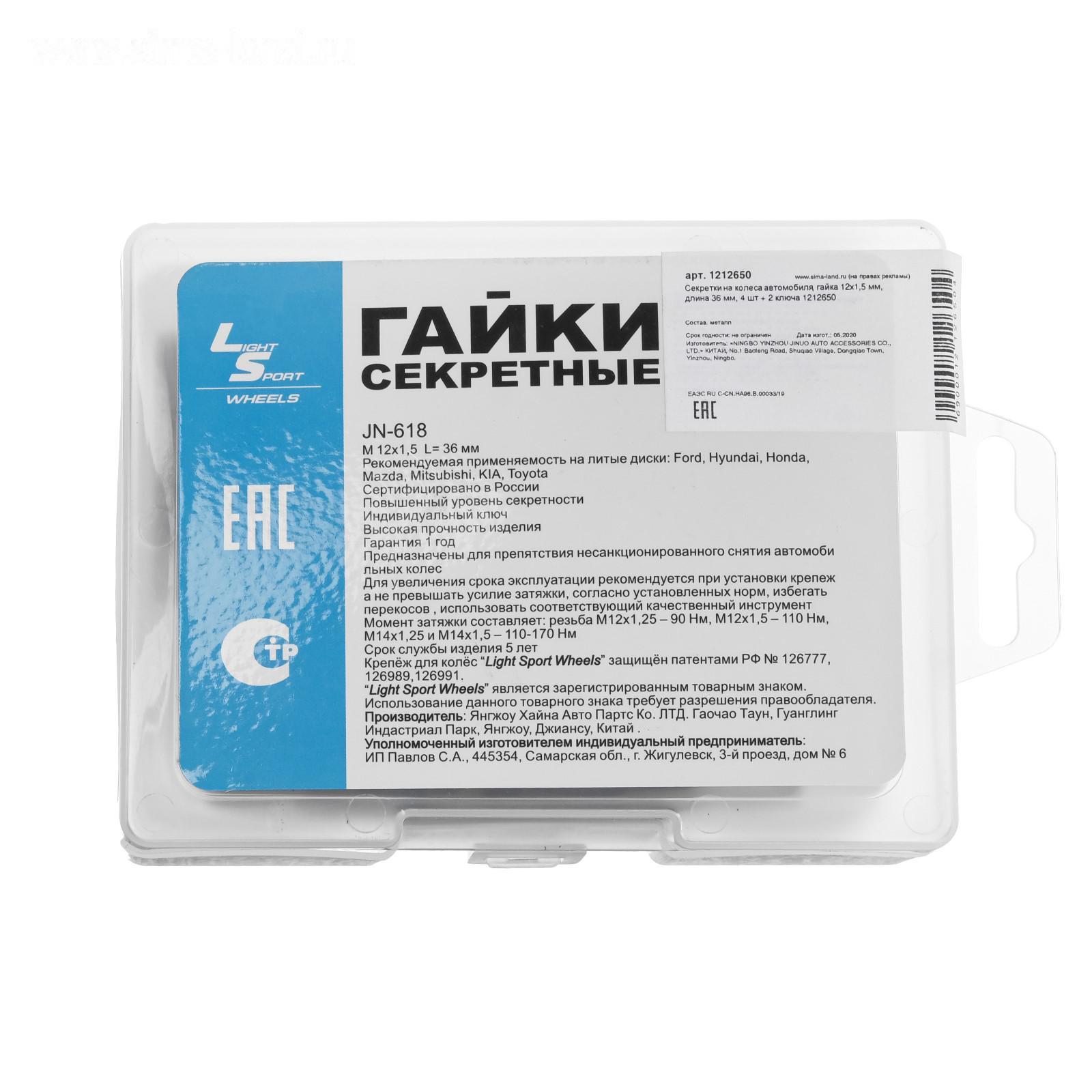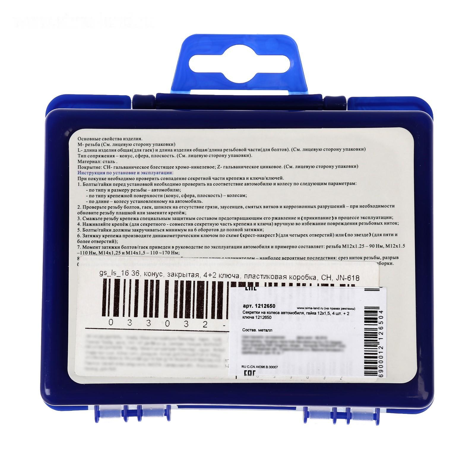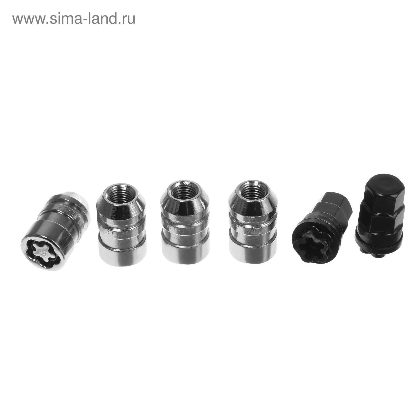 Секретки на колеса автомобиля, гайка 12x1.5 мм, длина 36 мм, 4 шт + 2 ключа