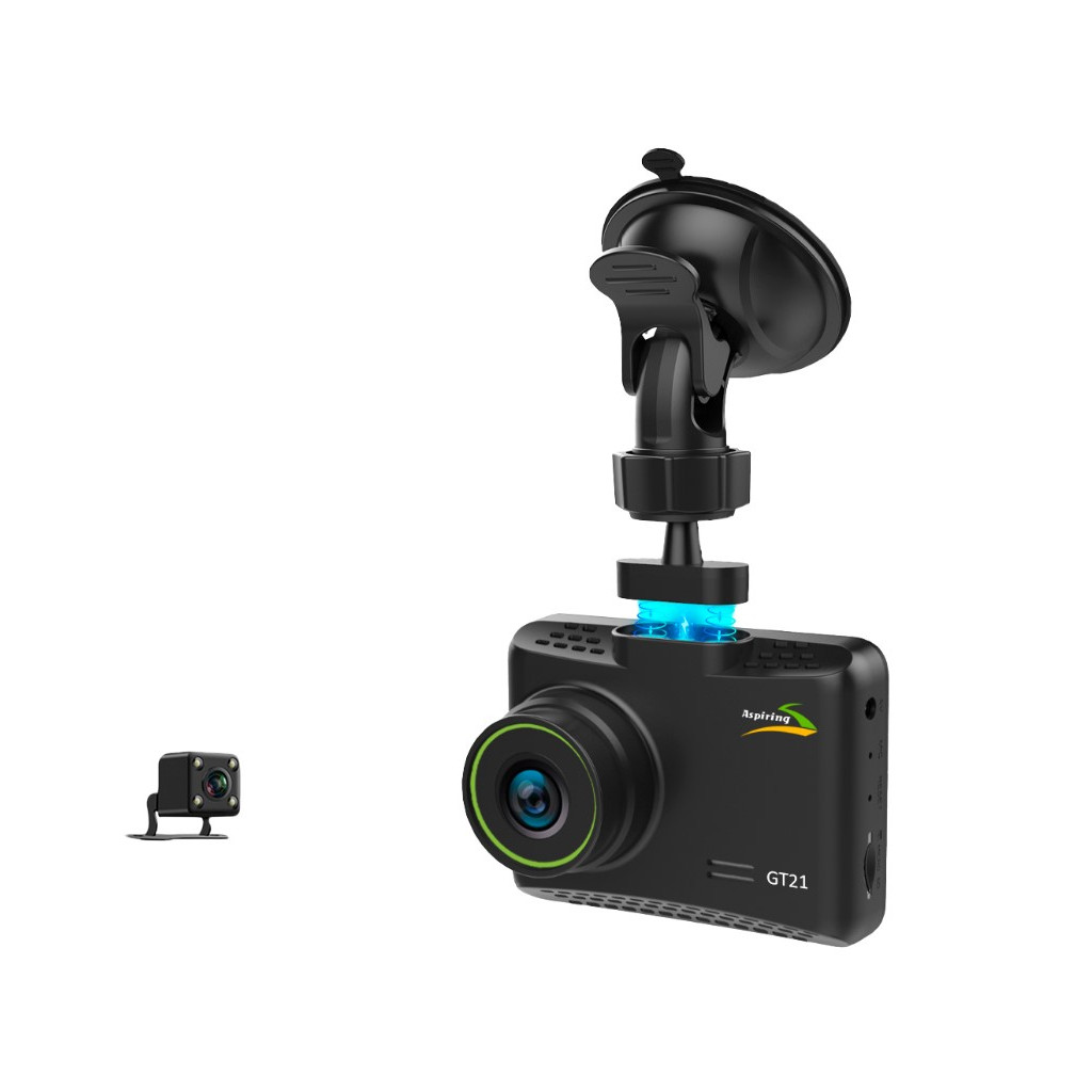 Aspiring GT21 DUAL FHD – це простий у використанні відеореєстратор з високою роздільною здатністю, оснащений дисплеєм 2,5″. Завдяки широкому куту огляду в 170° забезпечується охоплення всієї дороги.