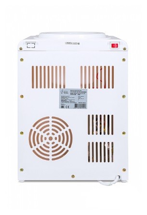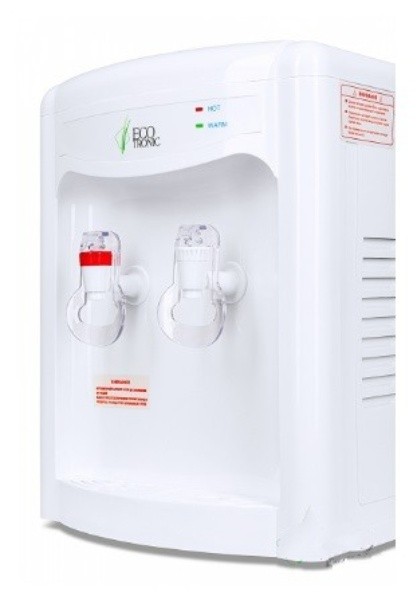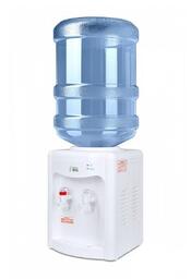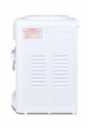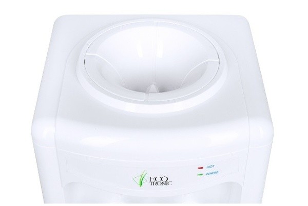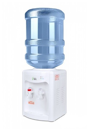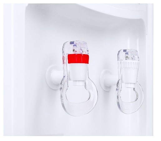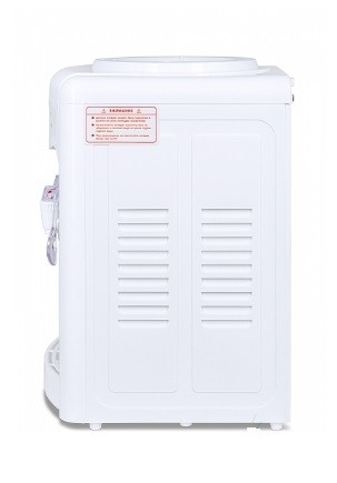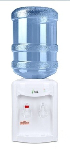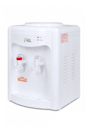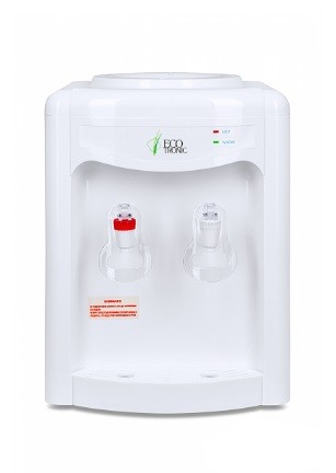 Настольный кулер без охлаждения, только нагрев. Бюджетная модель с доступной ценой. Белый пластиковый корпус, краны "Нажим кружкой": с красной маркировкой для горячей воды и с белой для воды комнатной температуры.