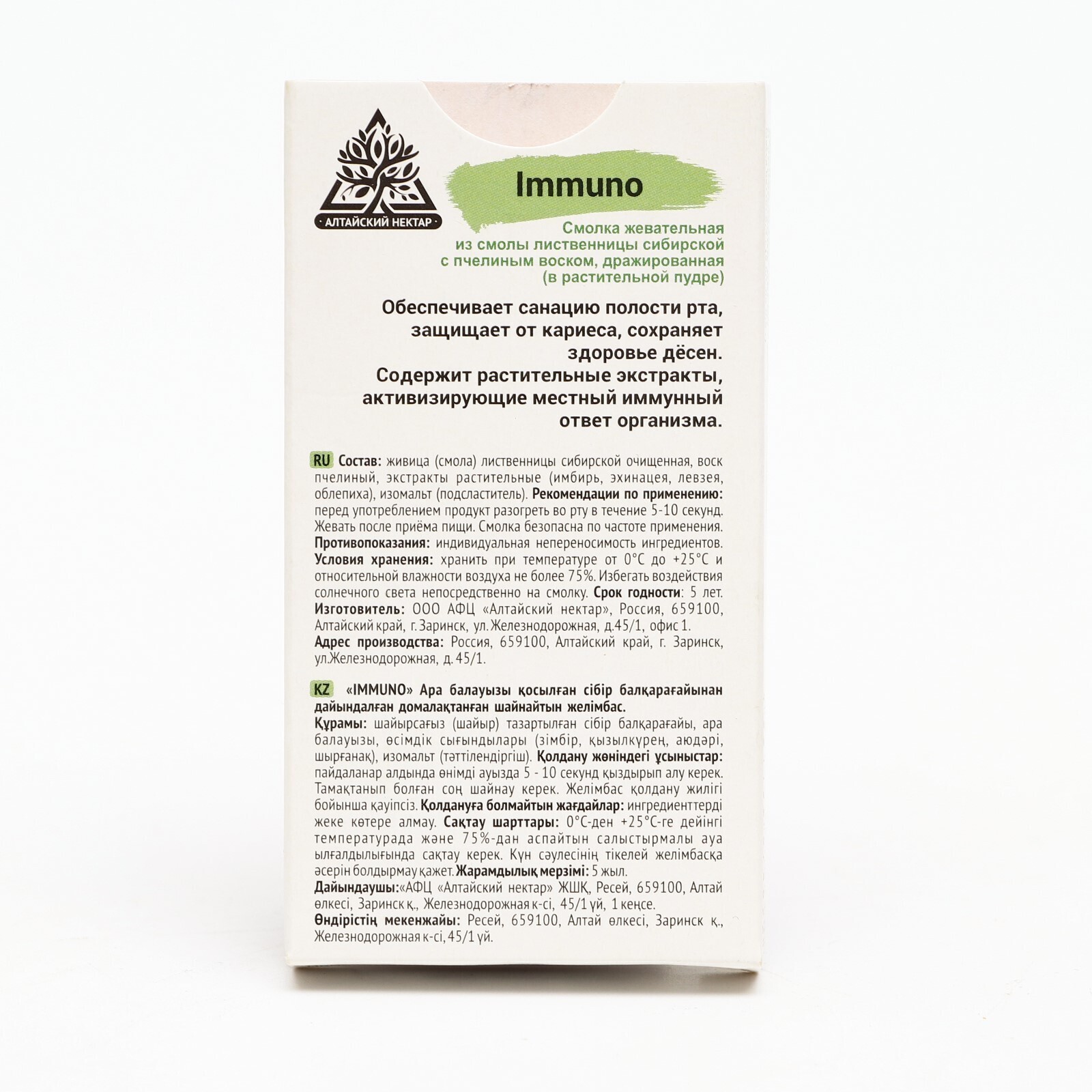 Состав: живица (смола) лиственницы сибирской очищенная, воск пчелиный, экстракты растительные (имбирь, эхинацея, левзея, облепиха), изомальт (подсластитель).