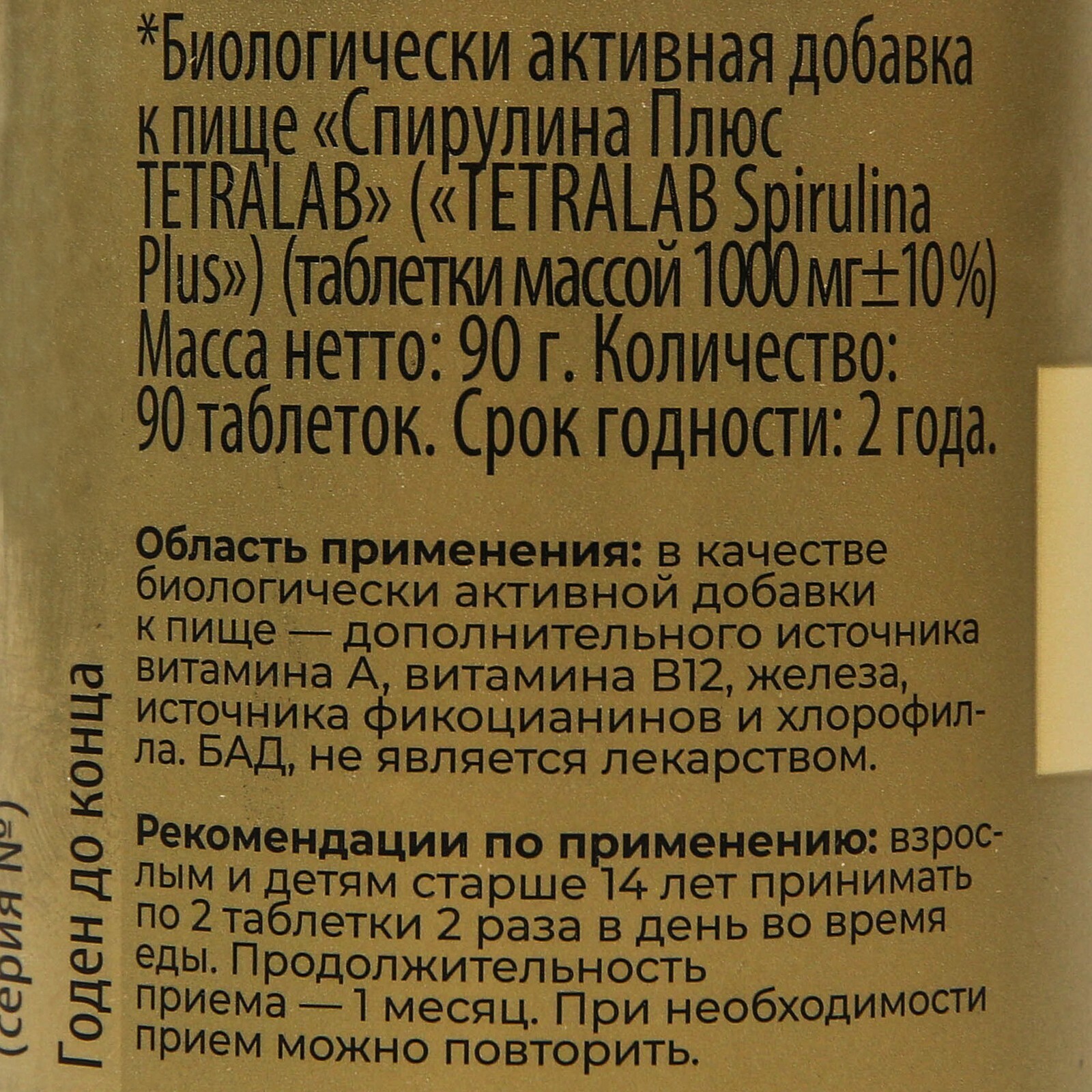 Назначение: рекомендуется в качестве дополнительного источника витаминов А и В12, железа, источника фикоцианинов и хлорофилла.