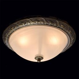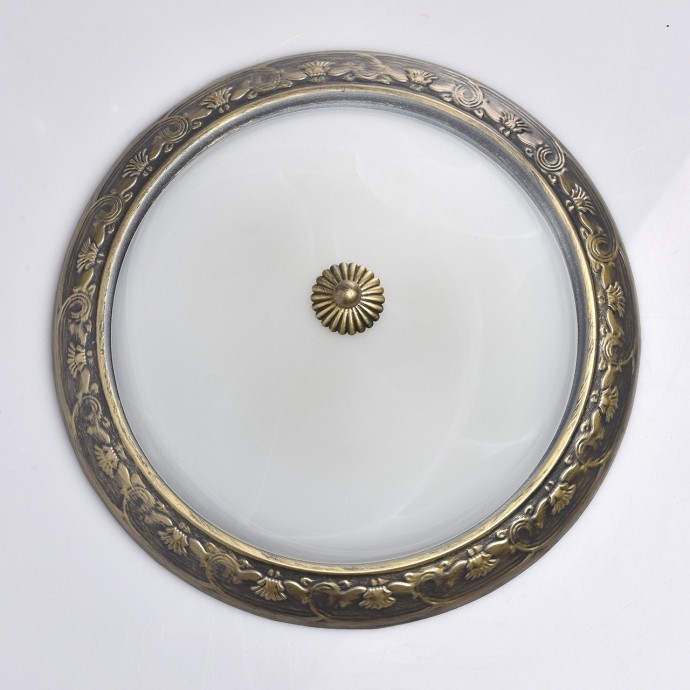 Основание: металл, прессование, гальванизировано в цвет античной бронзы, патинирование и лакирование. Плафон: алебастровое стекло, отлито в форму, матирование.