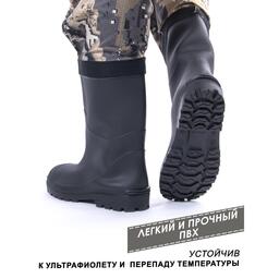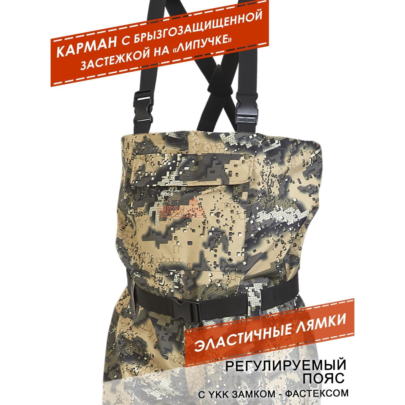 Верхняя часть забродного полукомбинезона сделана из высококачественного трехслойного «дышащего» материала. Сапоги изготовлены из легкого и прочного ПВХ. Карман с брызгозащитной застежкой-молнией. Регулируемые лямки. Регулируемый пояс.