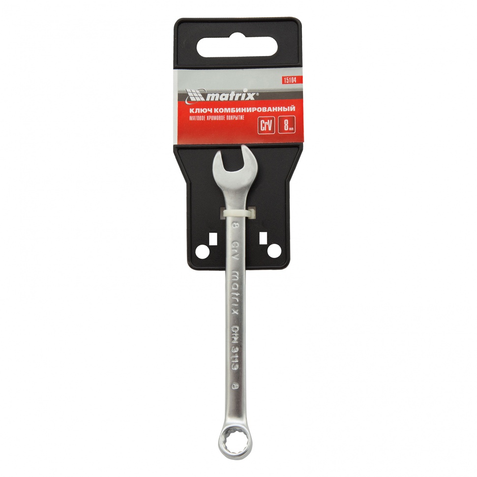 Ключ комбинированный Matrix 15104 из стали CrV, 8 мм, с покрытием «матовый хром», пригодится при проведении ремонтных работ дома или в гараже. С его помощью можно осуществлять быстрый монтаж и демонтаж крепежных элементов. Кольцевой зев обеспечивает удобство работы благодаря углу наклона 15 градусов относительно плоскости инструмента.ПреимуществаКлюч из хромованадиевой стали обладает необходимыми прочностными характеристиками и высокой сопротивляемостью деформации.Рабочая часть ключа прошла закалку до твердости 45 HRC в соответствии с требованиями ГОСТа.Матовое хромовое покрытие защищает ключ от образования коррозии.Накидные части с 12-гранным профилем позволяют охватить крепеж по всей поверхности, за счет чего снижается риск деформации его граней.Ключ удобно хранить и он не потеряется во время транспортировки, т.к. упакован в пластиковый держатель.