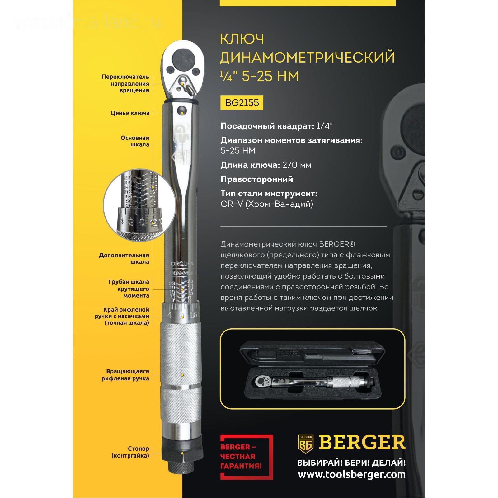 Ключ динамометрический BERGER BG2155, 1/4", 5-25 Нм