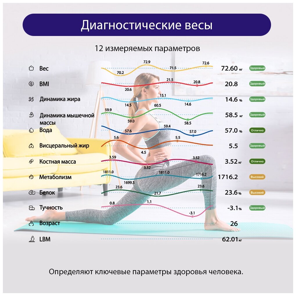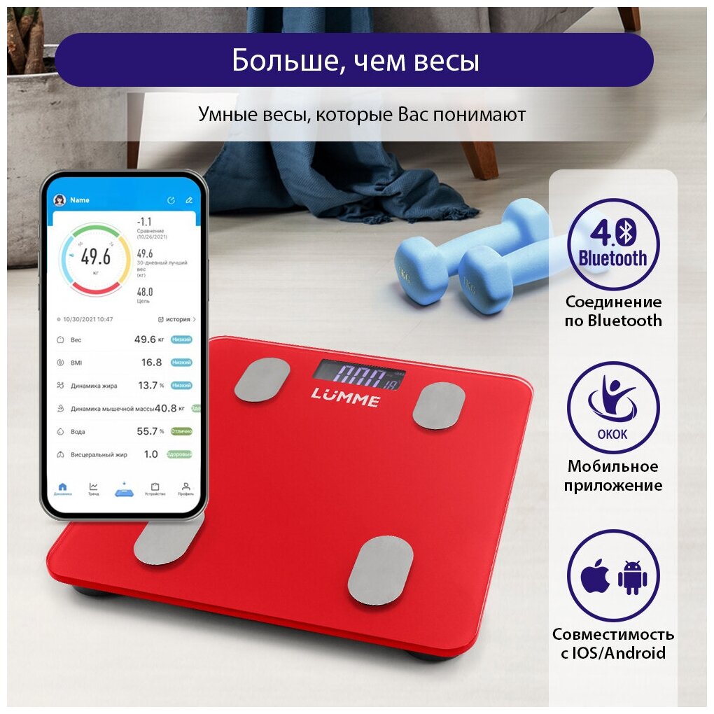 Напольные весы LUMME LU-1334 – умные диагностические весы с 4 сенсорами, ЖК дисплеем и синхронизацией с телефоном на Ios и Android. Используются для измерения уровня жира, воды, мышечной и костной массы. Весы обеспечивают взвешивание до 180 килограммов с точностью до 50 граммов, способны работать в различных единицах измерения веса (килограмм / фунт / стоун), в диапазоне значений роста от 75 до 225 сантиметров и в диапазоне значений возраста от 10 до 85 лет. 8 ячеек памяти для фиксации информации об изменении в весе каждого члена семьи. Встроенный термометр определит температуру помещения. Для экономии заряда батарей весы отключаются автоматически, если не используются, а индикаторы перегрузки и замены батареи сделают работу весов бесперебойной в течение длительного времени.