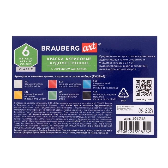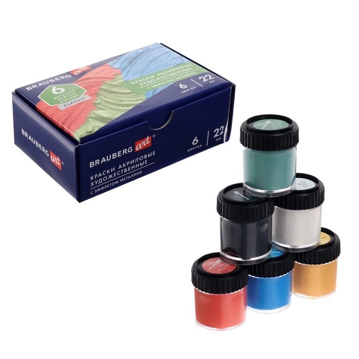 Краска акрил набор 6цв*22мл BRAUBERG, базовый металлик 191718