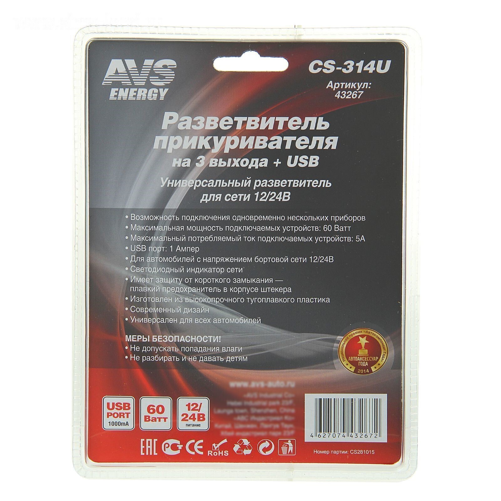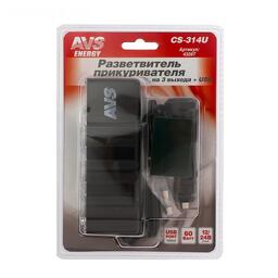 Разветвитель прикуривателя AVS CS314U, 12/24 В, на 3 выхода + USB