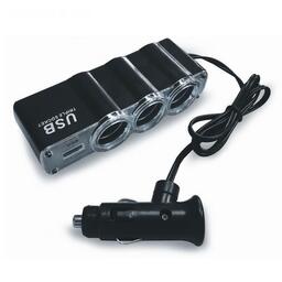 Разветвитель позволяет подключать до 4-х устройств одновременно в разъем прикуривателя через 3 собственных разъема прикуривателя и USB порт. Крепкое надежное устройство в корпусе из огнестойкого пластика. Защита от короткого замыкания и перепадов напряжения. Возможность установки в любой части автомобиля, благодаря проводу длиной 1 метр. Работа в сетях с номинальным напряжением 12В и 24В. Универсален для любых автомобилей.