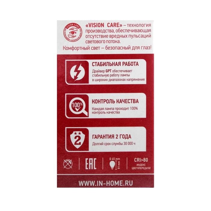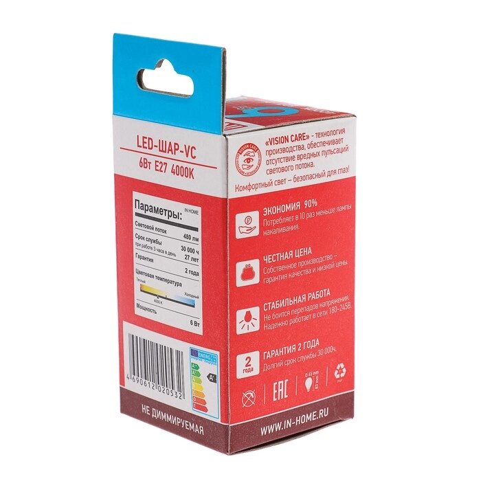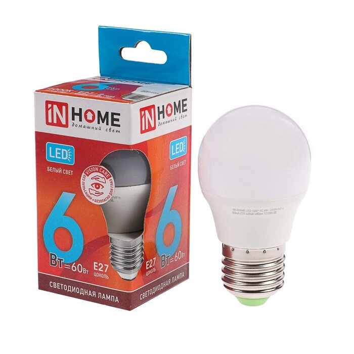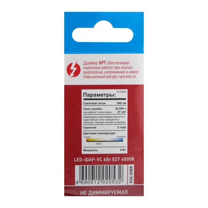 Лампа светодиодная IN HOME LED-шар-VC, е27, 6 вт, 230 в, 4000 к, 540 лм