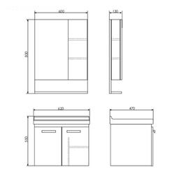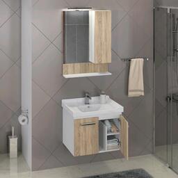 Дверца шкафа оснащена петлями с функцией плавного закрывания. В шкафу установлены 2 полки. Также под зеркалом расположена большая полка под принадлежности для умывания. Корпус изготовлен из ДСП белого цвета. Фасады выполнены в цвете «дуб сонома».