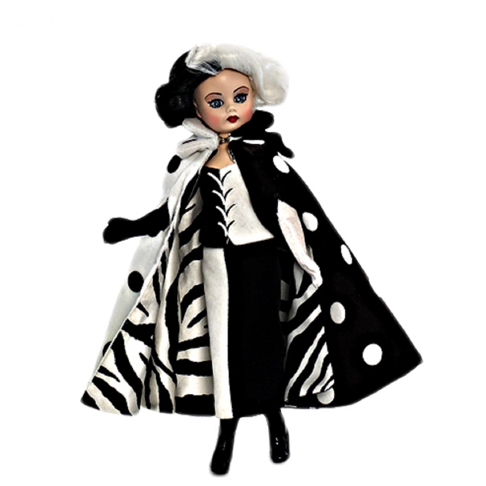 «Круэлла де Виль» — комический персонаж фильма «101 далматинец», который входит в число лучших диснеевских злодеев. Она эгоистична, зла и невероятно помешана на мехах. Кукла одета в эксцентричный костюм: длинное чёрно-белое платье и шубу-накидку той же цветовой гаммы. Ноги украшают чёрные лакированные сапожки. У Круэллы стильная короткая стрижка с завитыми локонами — волосы разделены по прямому пробору двумя оттенками — белым и чёрным. Образ героини завершает яркий макияж — глаза подчёркнуты тёмной подводкой, а губы — насыщенно-бордовой помадой.