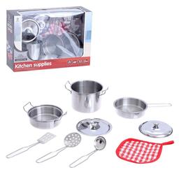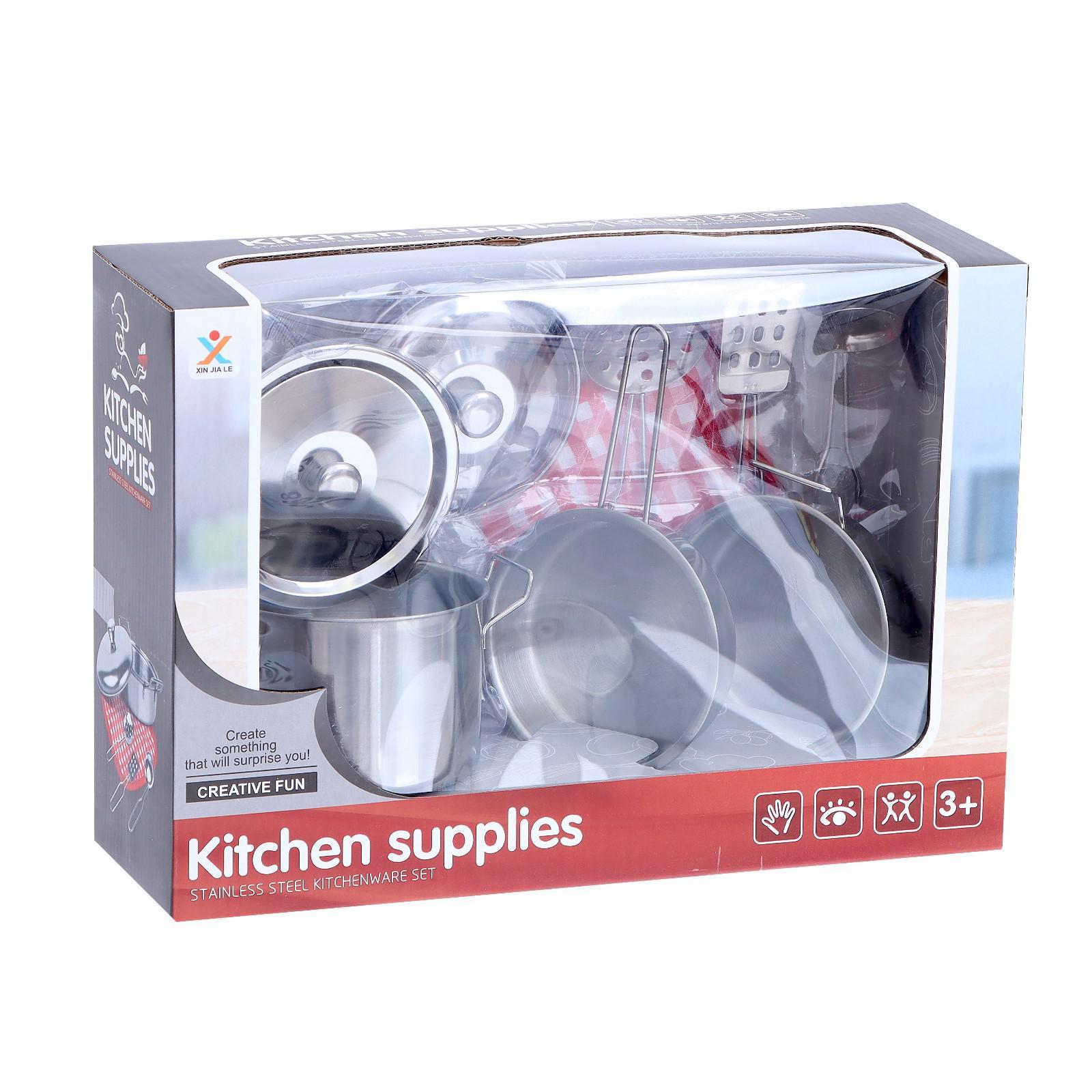 Набор металлической посуды — альтернатива взрослой кухонной утвари. В процессе игры малышка сможет абсолютно безопасно пользоваться принадлежностями для готовки: они лёгкие, простые в использовании, их размеры рассчитаны на ребёнка. Дочурка с удовольствием будет баловать свои игрушки кулинарными шедеврами, перенимая мамины рецепты.