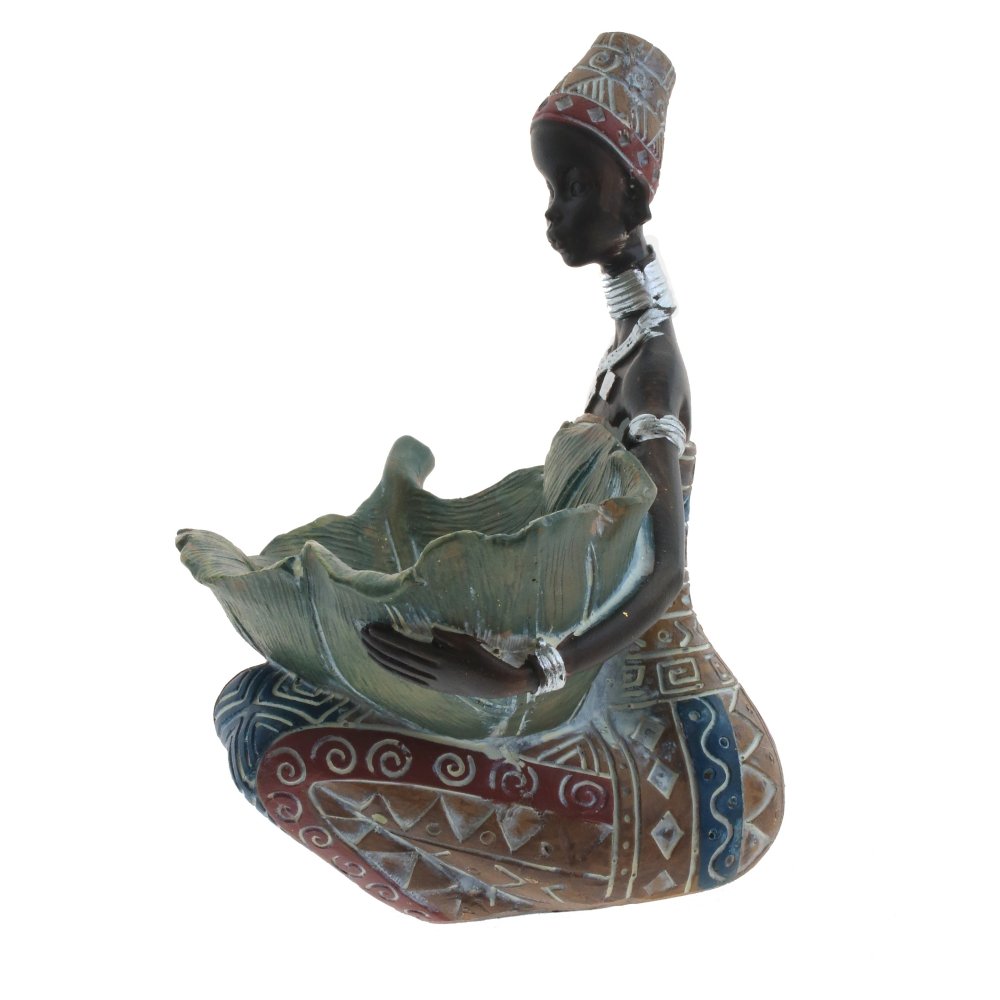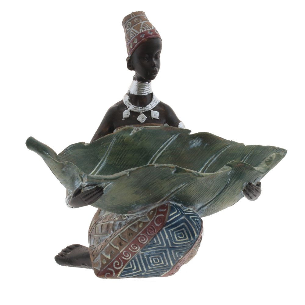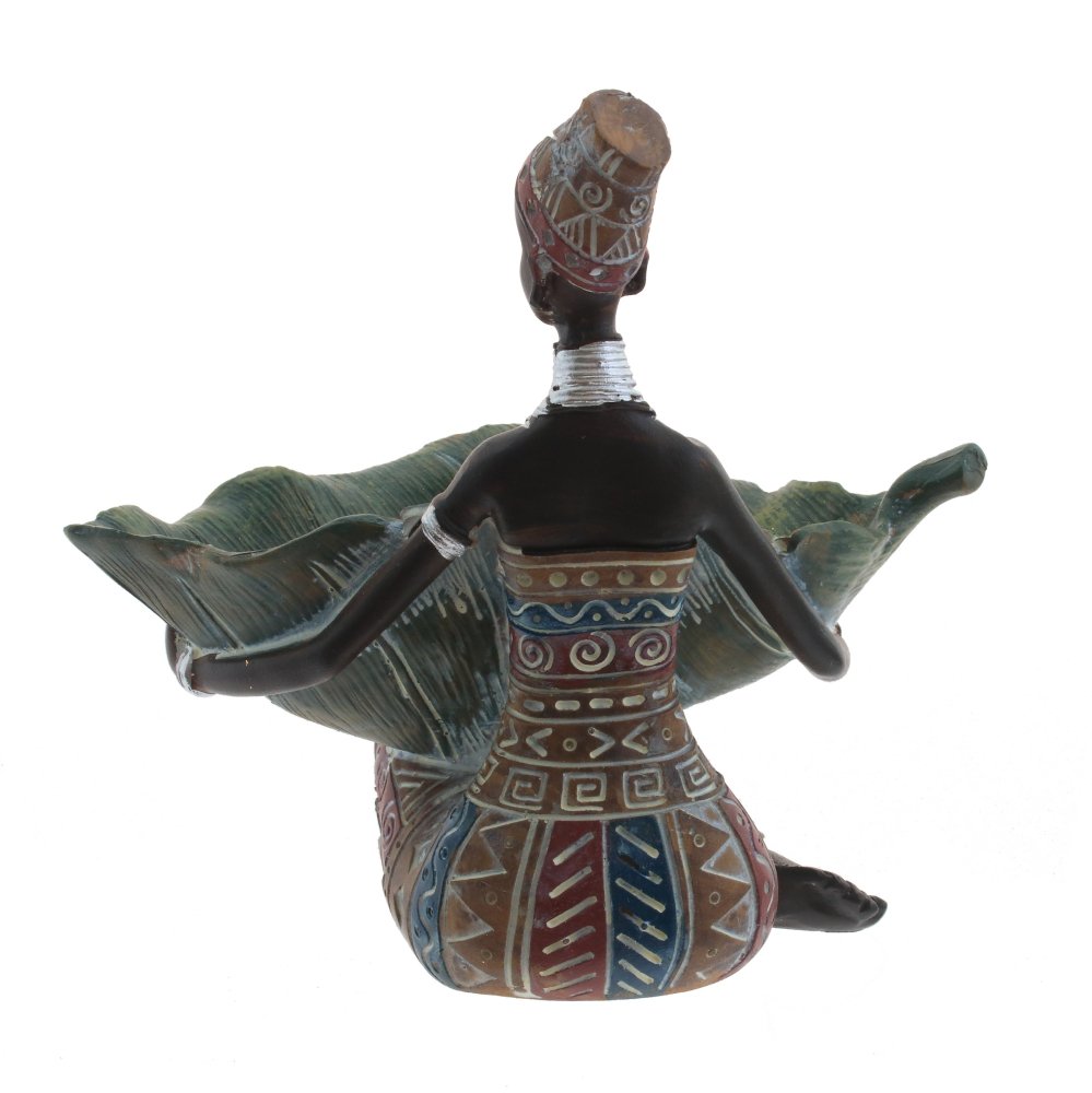Фигурка девушки африканки в ярком платье и с большим листом в руках, гармонично впишется в любой интерьер, создаст уют и оригинальность в вашем дизайне.