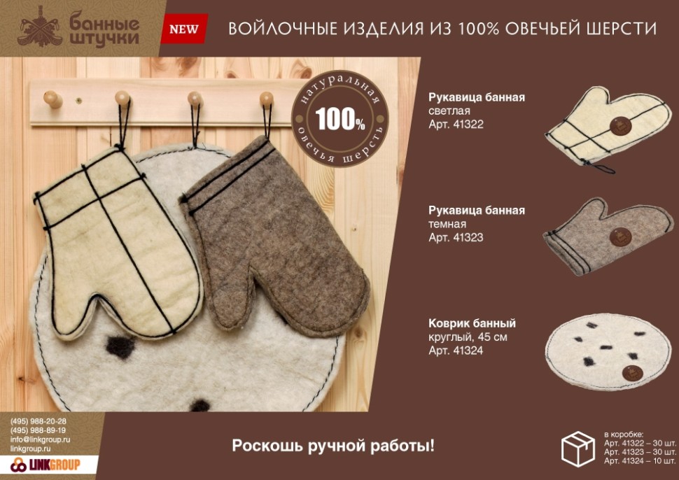 Войлочные изделия из натуральной овечьей шерсти прекрасно защищают от горячих температур в парной, благодаря пористой структуре. Каждое изделие, выполненное вручную, придаст индивидуальный облик самому изысканному банщику. Коллекция «Банные штучки» включает в себя всё самое необходимое – шапки, рукавицы и коврик для бани и сауны.
