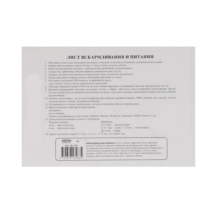 Амбулаторная карта ребёнка А5, 112 листов на клею